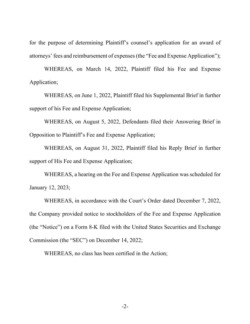 -2- for the purpose of determining Plaintiff’s counsel’s application for an award of attorneys’ fees and reimbursement of expenses (the “Fee and Expense Application”); WHEREAS, on March 14, 2022, Plaintiff filed his Fee and Expense Application; WHEREAS, on June 1, 2022, Plaintiff filed his Supplemental Brief in further support of his Fee and Expense Application; WHEREAS, on August 5, 2022, Defendants filed their Answering Brief in Opposition to Plaintiff’s Fee and Expense Application; WHEREAS, on August 31, 2022, Plaintiff filed his Reply Brief in further support of His Fee and Expense Application; WHEREAS, a hearing on the Fee and Expense Application was scheduled for January 12, 2023; WHEREAS, in accordance with the Court’s Order dated December 7, 2022, the Company provided notice to stockholders of the Fee and Expense Application (the “Notice”) on a Form 8-K filed with the United States Securities and Exchange Commission (the “SEC”) on December 14, 2022; WHEREAS, no class has been certified in the Action;
