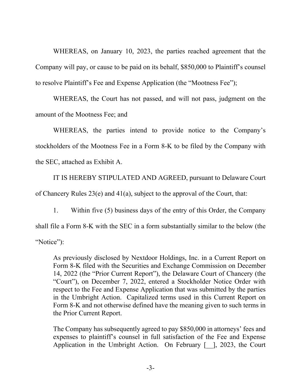 -3- WHEREAS, on January 10, 2023, the parties reached agreement that the Company will pay, or cause to be paid on its behalf, $850,000 to Plaintiff’s counsel to resolve Plaintiff’s Fee and Expense Application (the “Mootness Fee”); WHEREAS, the Court has not passed, and will not pass, judgment on the amount of the Mootness Fee; and WHEREAS, the parties intend to provide notice to the Company’s stockholders of the Mootness Fee in a Form 8-K to be filed by the Company with the SEC, attached as Exhibit A. IT IS HEREBY STIPULATED AND AGREED, pursuant to Delaware Court of Chancery Rules 23(e) and 41(a), subject to the approval of the Court, that: 1. Within five (5) business days of the entry of this Order, the Company shall file a Form 8-K with the SEC in a form substantially similar to the below (the “Notice”): As previously disclosed by Nextdoor Holdings, Inc. in a Current Report on Form 8-K filed with the Securities and Exchange Commission on December 14, 2022 (the “Prior Current Report”), the Delaware Court of Chancery (the “Court”), on December 7, 2022, entered a Stockholder Notice Order with respect to the Fee and Expense Application that was submitted by the parties in the Umbright Action. Capitalized terms used in this Current Report on Form 8-K and not otherwise defined have the meaning given to such terms in the Prior Current Report. The Company has subsequently agreed to pay $850,000 in attorneys’ fees and expenses to plaintiff’s counsel in full satisfaction of the Fee and Expense Application in the Umbright Action. On February [__], 2023, the Court