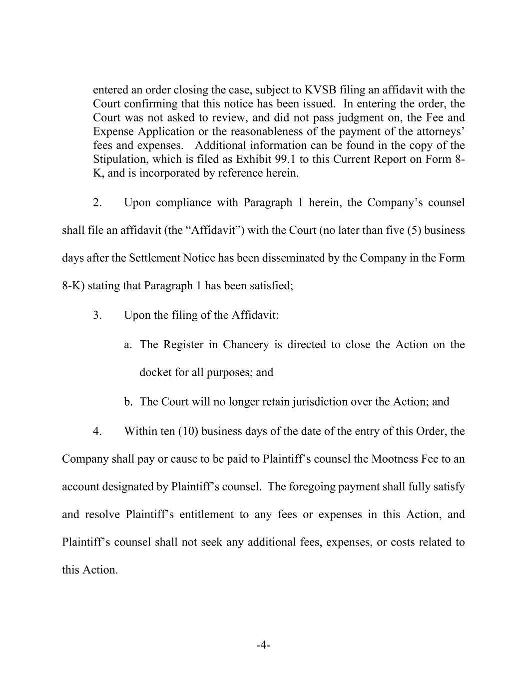 -4- entered an order closing the case, subject to KVSB filing an affidavit with the Court confirming that this notice has been issued. In entering the order, the Court was not asked to review, and did not pass judgment on, the Fee and Expense Application or the reasonableness of the payment of the attorneys’ fees and expenses. Additional information can be found in the copy of the Stipulation, which is filed as Exhibit 99.1 to this Current Report on Form 8- K, and is incorporated by reference herein. 2. Upon compliance with Paragraph 1 herein, the Company’s counsel shall file an affidavit (the “Affidavit”) with the Court (no later than five (5) business days after the Settlement Notice has been disseminated by the Company in the Form 8-K) stating that Paragraph 1 has been satisfied; 3. Upon the filing of the Affidavit: a. The Register in Chancery is directed to close the Action on the docket for all purposes; and b. The Court will no longer retain jurisdiction over the Action; and 4. Within ten (10) business days of the date of the entry of this Order, the Company shall pay or cause to be paid to Plaintiff’s counsel the Mootness Fee to an account designated by Plaintiff’s counsel. The foregoing payment shall fully satisfy and resolve Plaintiff’s entitlement to any fees or expenses in this Action, and Plaintiff’s counsel shall not seek any additional fees, expenses, or costs related to this Action.