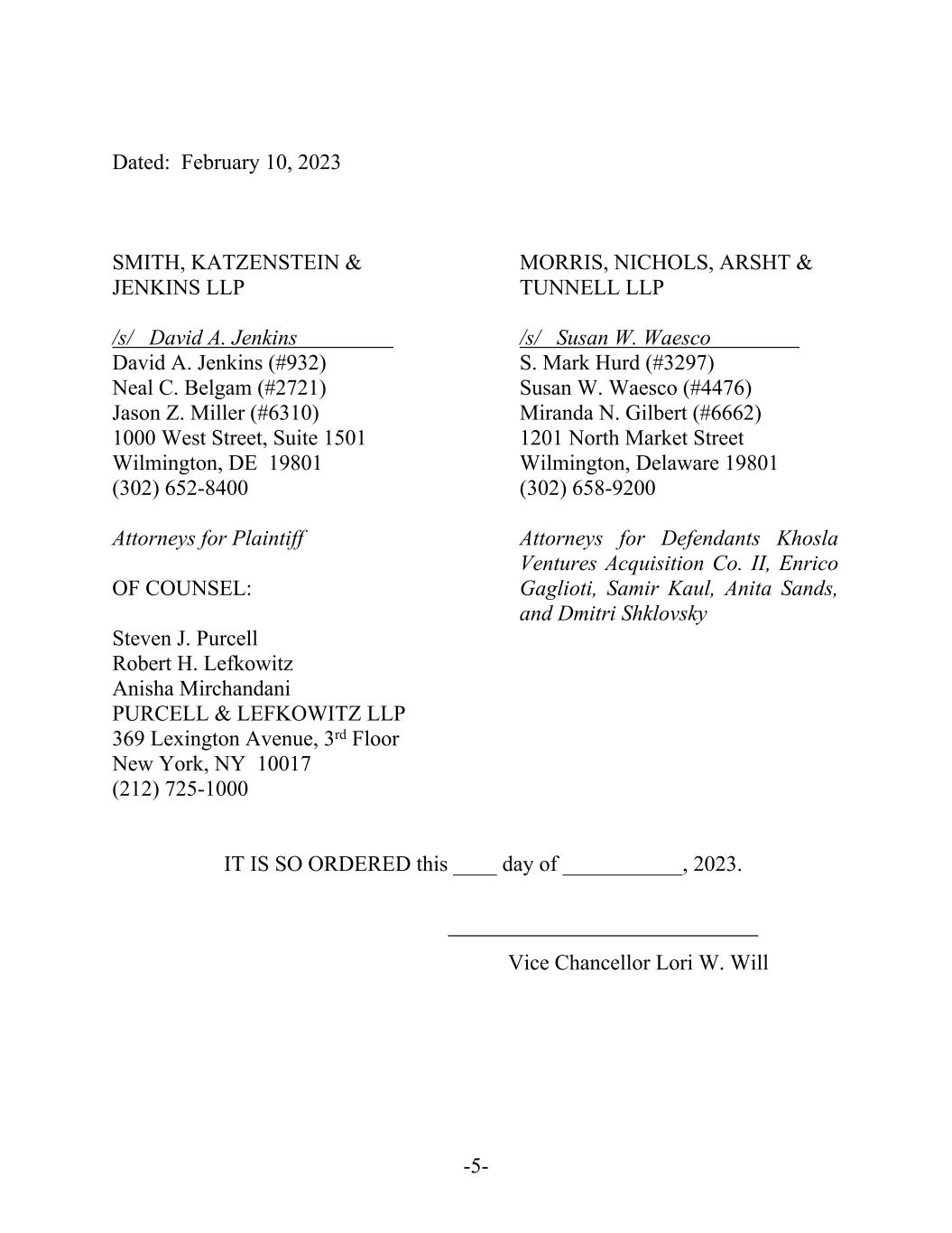 -5- Dated: February 10, 2023 SMITH, KATZENSTEIN & JENKINS LLP /s/ David A. Jenkins David A. Jenkins (#932) Neal C. Belgam (#2721) Jason Z. Miller (#6310) 1000 West Street, Suite 1501 Wilmington, DE 19801 (302) 652-8400 Attorneys for Plaintiff OF COUNSEL: Steven J. Purcell Robert H. Lefkowitz Anisha Mirchandani PURCELL & LEFKOWITZ LLP 369 Lexington Avenue, 3rd Floor New York, NY 10017 (212) 725-1000 MORRIS, NICHOLS, ARSHT & TUNNELL LLP /s/ Susan W. Waesco S. Mark Hurd (#3297) Susan W. Waesco (#4476) Miranda N. Gilbert (#6662) 1201 North Market Street Wilmington, Delaware 19801 (302) 658-9200 Attorneys for Defendants Khosla Ventures Acquisition Co. II, Enrico Gaglioti, Samir Kaul, Anita Sands, and Dmitri Shklovsky IT IS SO ORDERED this ____ day of ___________, 2023. Vice Chancellor Lori W. Will