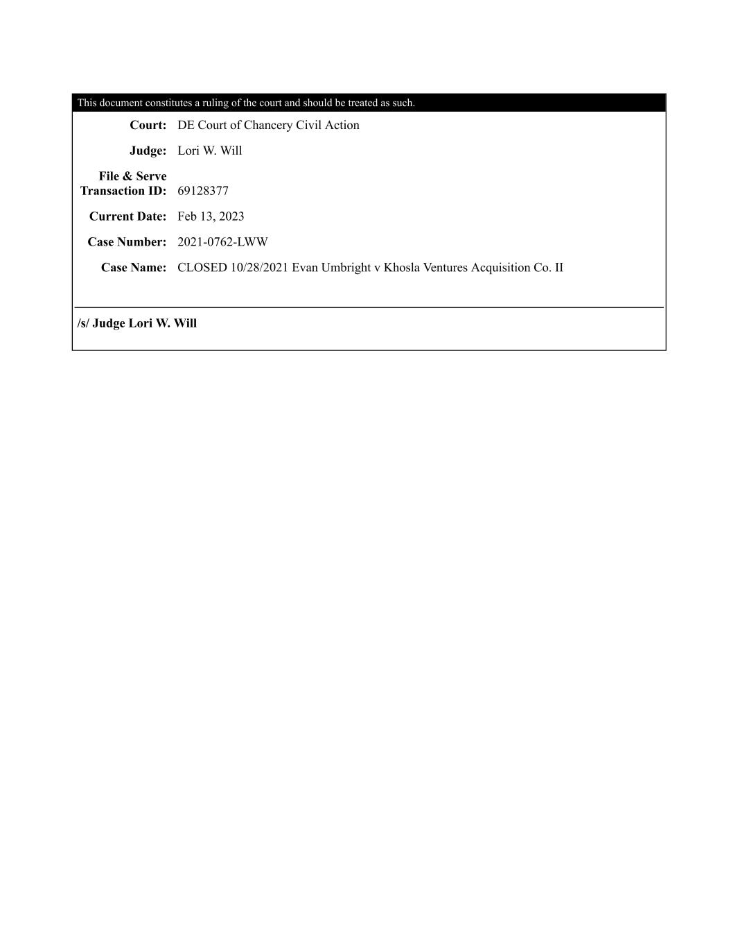 This document constitutes a ruling of the court and should be treated as such. Court: DE Court of Chancery Civil Action Judge: Lori W. Will File & Serve Transaction ID: 69128377 Current Date: Feb 13, 2023 Case Number: 2021-0762-LWW Case Name: CLOSED 10/28/2021 Evan Umbright v Khosla Ventures Acquisition Co. II /s/ Judge Lori W. Will