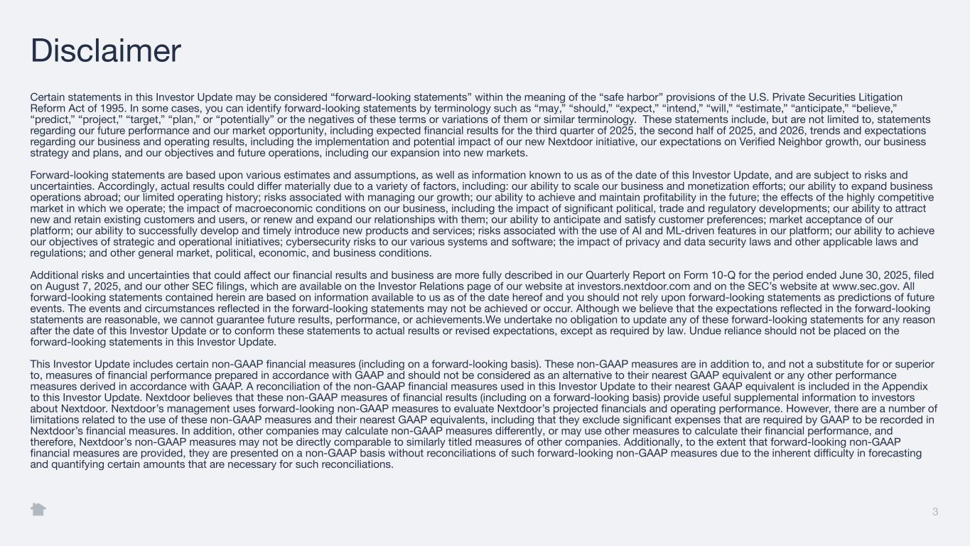 Certain statements in this Investor Update may be considered “forward-looking statements” within the meaning of the “safe harbor” provisions of the U.S. Private Securities Litigation Reform Act of 1995. In some cases, you can identify forward-looking statements by terminology such as “may,” “should,” “expect,” “intend,” “will,” “estimate,” “anticipate,” “believe,” “predict,” “project,” “target,” “plan,” or “potentially” or the negatives of these terms or variations of them or similar terminology. These statements include, but are not limited to, statements regarding our future performance and our market opportunity, including expected financial results for the third quarter of 2025, the second half of 2025, and 2026, trends and expectations regarding our business and operating results, including the implementation and potential impact of our new Nextdoor initiative, our expectations on Verified Neighbor growth, our business strategy and plans, and our objectives and future operations, including our expansion into new markets. Forward-looking statements are based upon various estimates and assumptions, as well as information known to us as of the date of this Investor Update, and are subject to risks and uncertainties. Accordingly, actual results could differ materially due to a variety of factors, including: our ability to scale our business and monetization efforts; our ability to expand business operations abroad; our limited operating history; risks associated with managing our growth; our ability to achieve and maintain profitability in the future; the effects of the highly competitive market in which we operate; the impact of macroeconomic conditions on our business, including the impact of significant political, trade and regulatory developments; our ability to attract new and retain existing customers and users, or renew and expand our relationships with them; our ability to anticipate and satisfy customer preferences; market acceptance of our platform; our ability to successfully develop and timely introduce new products and services; risks associated with the use of AI and ML-driven features in our platform; our ability to achieve our objectives of strategic and operational initiatives; cybersecurity risks to our various systems and software; the impact of privacy and data security laws and other applicable laws and regulations; and other general market, political, economic, and business conditions. Additional risks and uncertainties that could affect our financial results and business are more fully described in our Quarterly Report on Form 10-Q for the period ended June 30, 2025, filed on August 7, 2025, and our other SEC filings, which are available on the Investor Relations page of our website at investors.nextdoor.com and on the SEC’s website at www.sec.gov. All forward-looking statements contained herein are based on information available to us as of the date hereof and you should not rely upon forward-looking statements as predictions of future events. The events and circumstances reflected in the forward-looking statements may not be achieved or occur. Although we believe that the expectations reflected in the forward-looking statements are reasonable, we cannot guarantee future results, performance, or achievements.We undertake no obligation to update any of these forward-looking statements for any reason after the date of this Investor Update or to conform these statements to actual results or revised expectations, except as required by law. Undue reliance should not be placed on the forward-looking statements in this Investor Update. This Investor Update includes certain non-GAAP financial measures (including on a forward-looking basis). These non-GAAP measures are in addition to, and not a substitute for or superior to, measures of financial performance prepared in accordance with GAAP and should not be considered as an alternative to their nearest GAAP equivalent or any other performance measures derived in accordance with GAAP. A reconciliation of the non-GAAP financial measures used in this Investor Update to their nearest GAAP equivalent is included in the Appendix to this Investor Update. Nextdoor believes that these non-GAAP measures of financial results (including on a forward-looking basis) provide useful supplemental information to investors about Nextdoor. Nextdoor’s management uses forward-looking non-GAAP measures to evaluate Nextdoor’s projected financials and operating performance. However, there are a number of limitations related to the use of these non-GAAP measures and their nearest GAAP equivalents, including that they exclude significant expenses that are required by GAAP to be recorded in Nextdoor’s financial measures. In addition, other companies may calculate non-GAAP measures differently, or may use other measures to calculate their financial performance, and therefore, Nextdoor’s non-GAAP measures may not be directly comparable to similarly titled measures of other companies. Additionally, to the extent that forward-looking non-GAAP financial measures are provided, they are presented on a non-GAAP basis without reconciliations of such forward-looking non-GAAP measures due to the inherent difficulty in forecasting and quantifying certain amounts that are necessary for such reconciliations. 3 Disclaimer