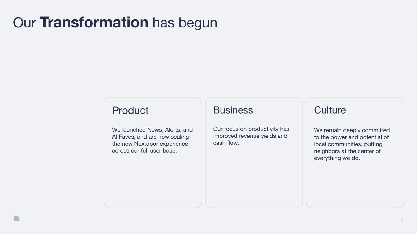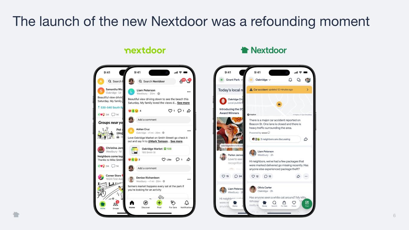 5 Our Transformation has begun Business Our focus on productivity has improved revenue yields and cash flow. Culture We remain deeply committed to the power and potential of local communities, putting neighbors at the center of everything we do. Product We launched News, Alerts, and AI Faves, and are now scaling the new Nextdoor experience across our full user base.