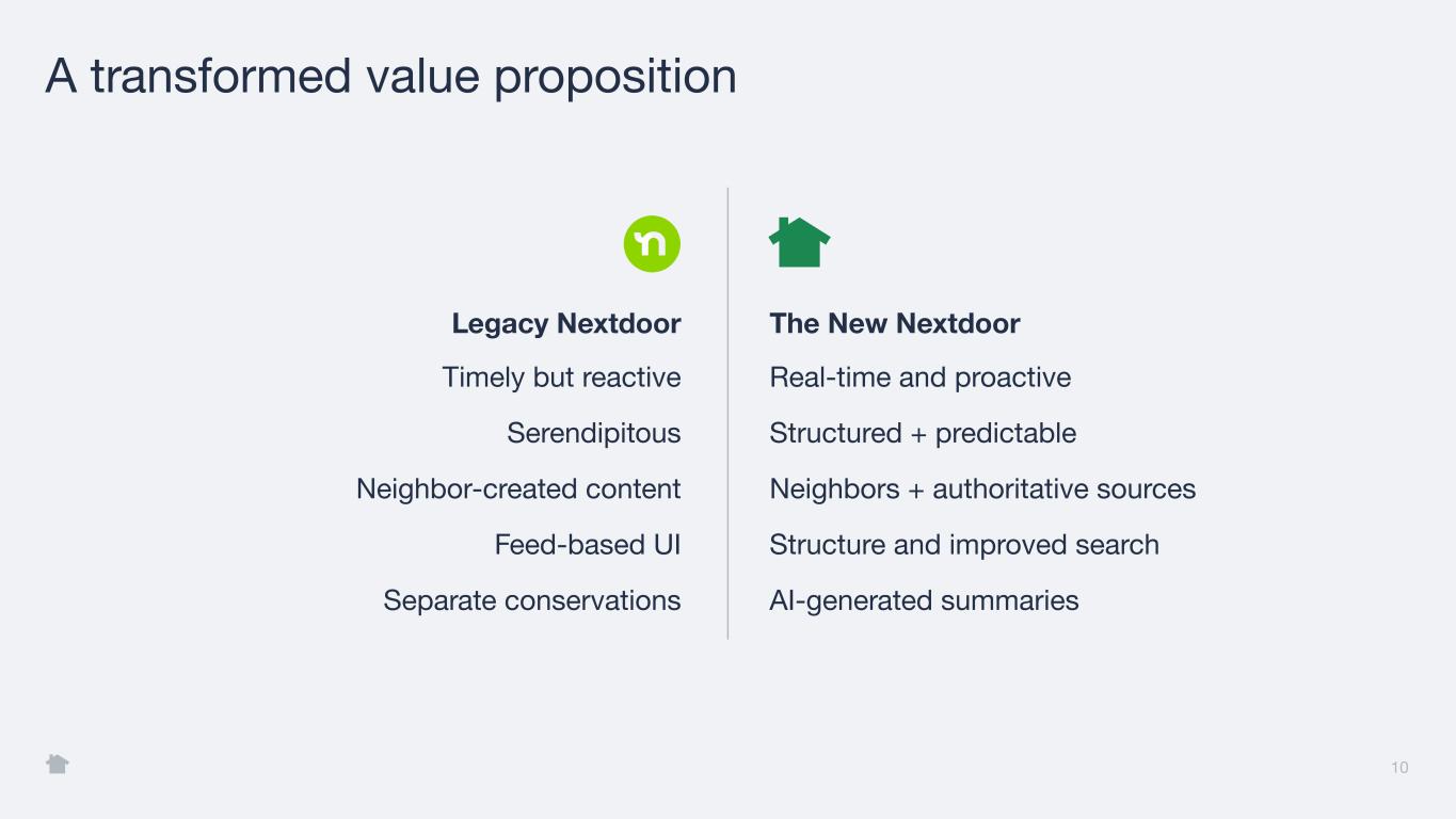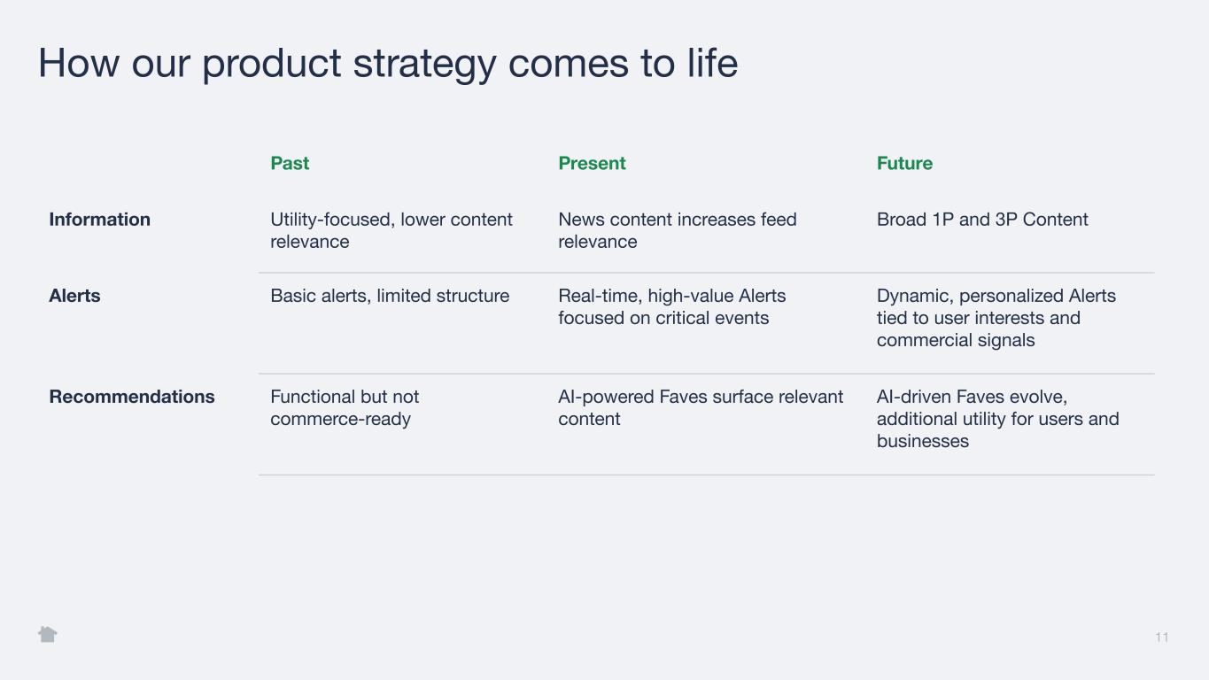 10 A transformed value proposition Legacy Nextdoor The New Nextdoor Timely but reactive Real-time and proactive Serendipitous Structured + predictable Neighbor-created content Neighbors + authoritative sources Feed-based UI Structure and improved search Separate conservations AI-generated summaries