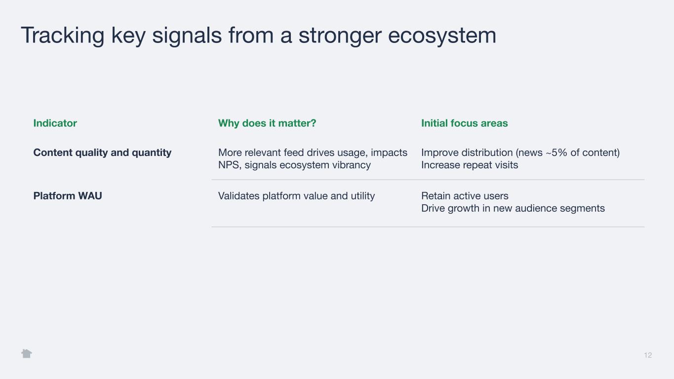How our product strategy comes to life Past Present Future Information Utility-focused, lower content relevance News content increases feed relevance Broad 1P and 3P Content Alerts Basic alerts, limited structure Real-time, high-value Alerts focused on critical events Dynamic, personalized Alerts tied to user interests and commercial signals Recommendations Functional but not commerce-ready AI-powered Faves surface relevant content AI-driven Faves evolve, additional utility for users and businesses 11