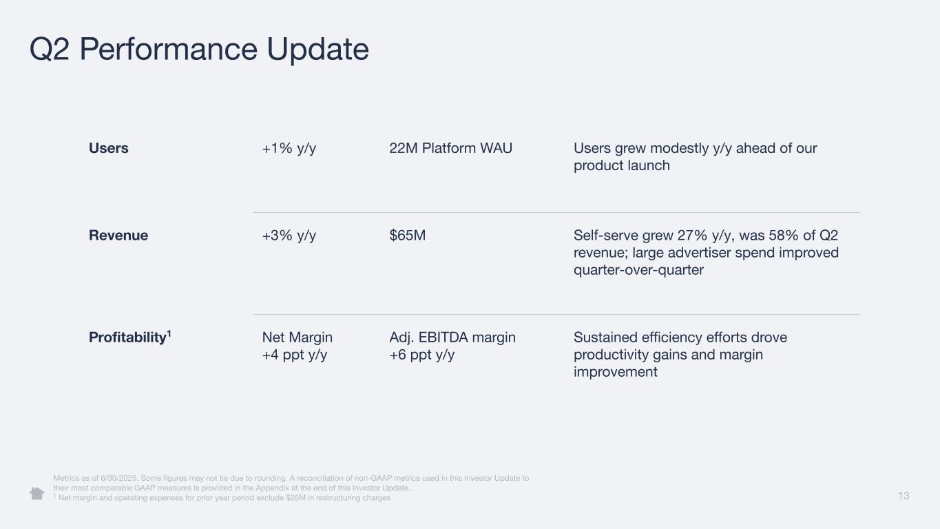13 Q2 Performance Update Users +1% y/y 22M Platform WAU Users grew modestly y/y ahead of our product launch Revenue +3% y/y $65M Self-serve grew 27% y/y, was 58% of Q2 revenue; large advertiser spend improved quarter-over-quarter Profitability1 Net Margin +4 ppt y/y Adj. EBITDA margin +6 ppt y/y Sustained efficiency efforts drove productivity gains and margin improvement Metrics as of 6/30/2025. Some figures may not tie due to rounding. A reconciliation of non-GAAP metrics used in this Investor Update to their most comparable GAAP measures is provided in the Appendix at the end of this Investor Update.. 1 Net margin and operating expenses for prior year period exclude $26M in restructuring charges