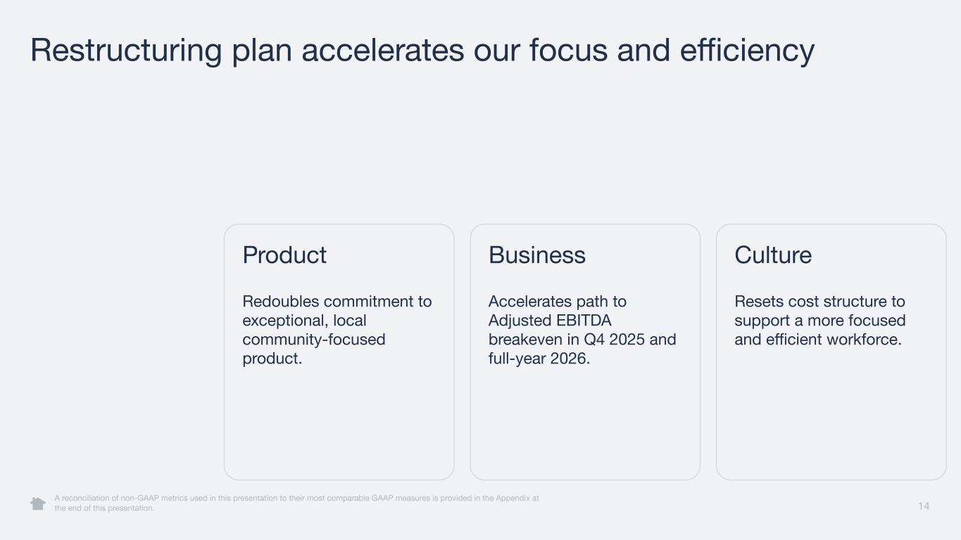 Product Redoubles commitment to exceptional, local community-focused product. 14 Culture Resets cost structure to support a more focused and efficient workforce. Business Accelerates path to Adjusted EBITDA breakeven in Q4 2025 and full-year 2026. Restructuring plan accelerates our focus and efficiency A reconciliation of non-GAAP metrics used in this presentation to their most comparable GAAP measures is provided in the Appendix at the end of this presentation.