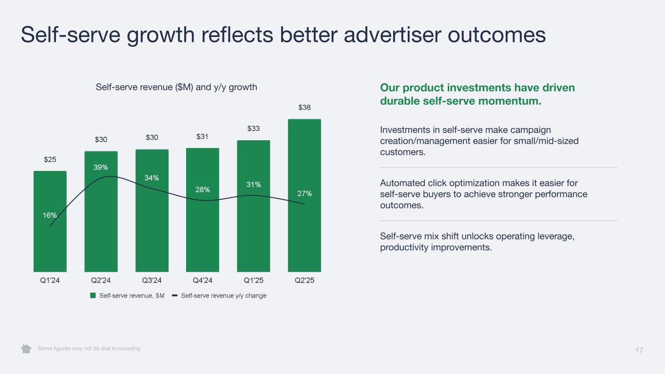 17 Self-serve growth reflects better advertiser outcomes Some figures may not tie due to rounding. Our product investments have driven durable self-serve momentum. Investments in self-serve make campaign creation/management easier for small/mid-sized customers. Automated click optimization makes it easier for self-serve buyers to achieve stronger performance outcomes. Self-serve mix shift unlocks operating leverage, productivity improvements. Self-serve revenue ($M) and y/y growth