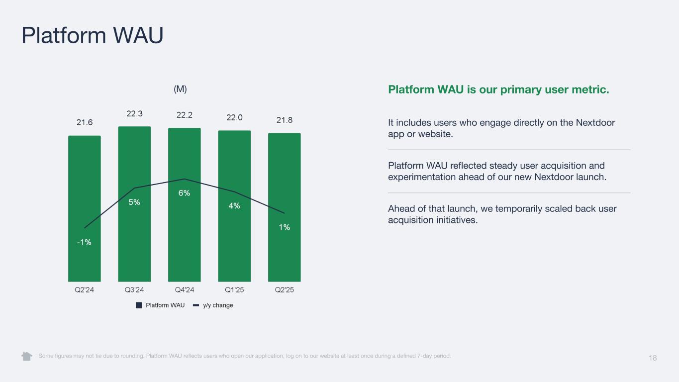 18 Platform WAU Some figures may not tie due to rounding. Platform WAU reflects users who open our application, log on to our website at least once during a defined 7-day period. Platform WAU is our primary user metric. It includes users who engage directly on the Nextdoor app or website. Platform WAU reflected steady user acquisition and experimentation ahead of our new Nextdoor launch. Ahead of that launch, we temporarily scaled back user acquisition initiatives. (M)