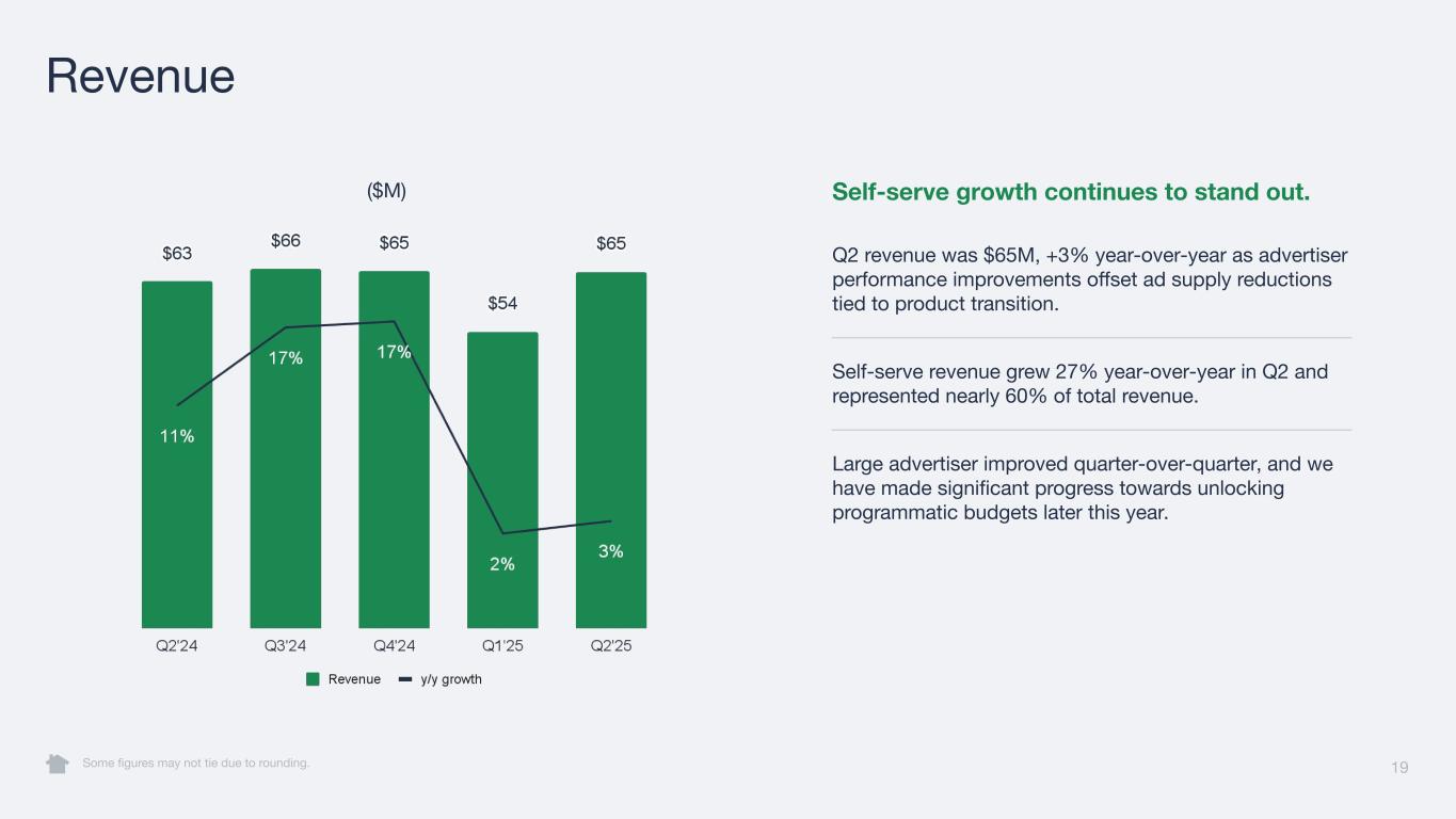 19 Revenue Some figures may not tie due to rounding. ($M) Self-serve growth continues to stand out. Q2 revenue was $65M, +3% year-over-year as advertiser performance improvements offset ad supply reductions tied to product transition. Self-serve revenue grew 27% year-over-year in Q2 and represented nearly 60% of total revenue. Large advertiser improved quarter-over-quarter, and we have made significant progress towards unlocking programmatic budgets later this year.