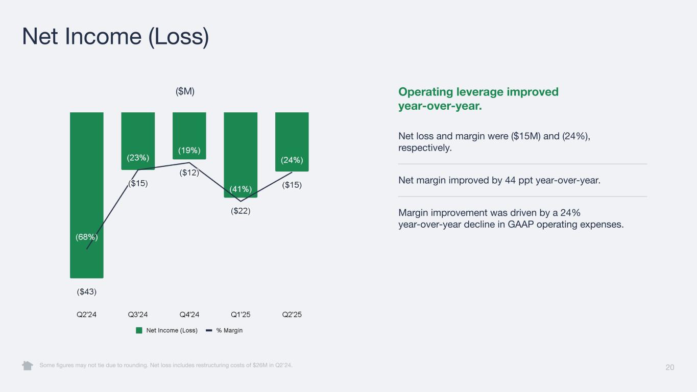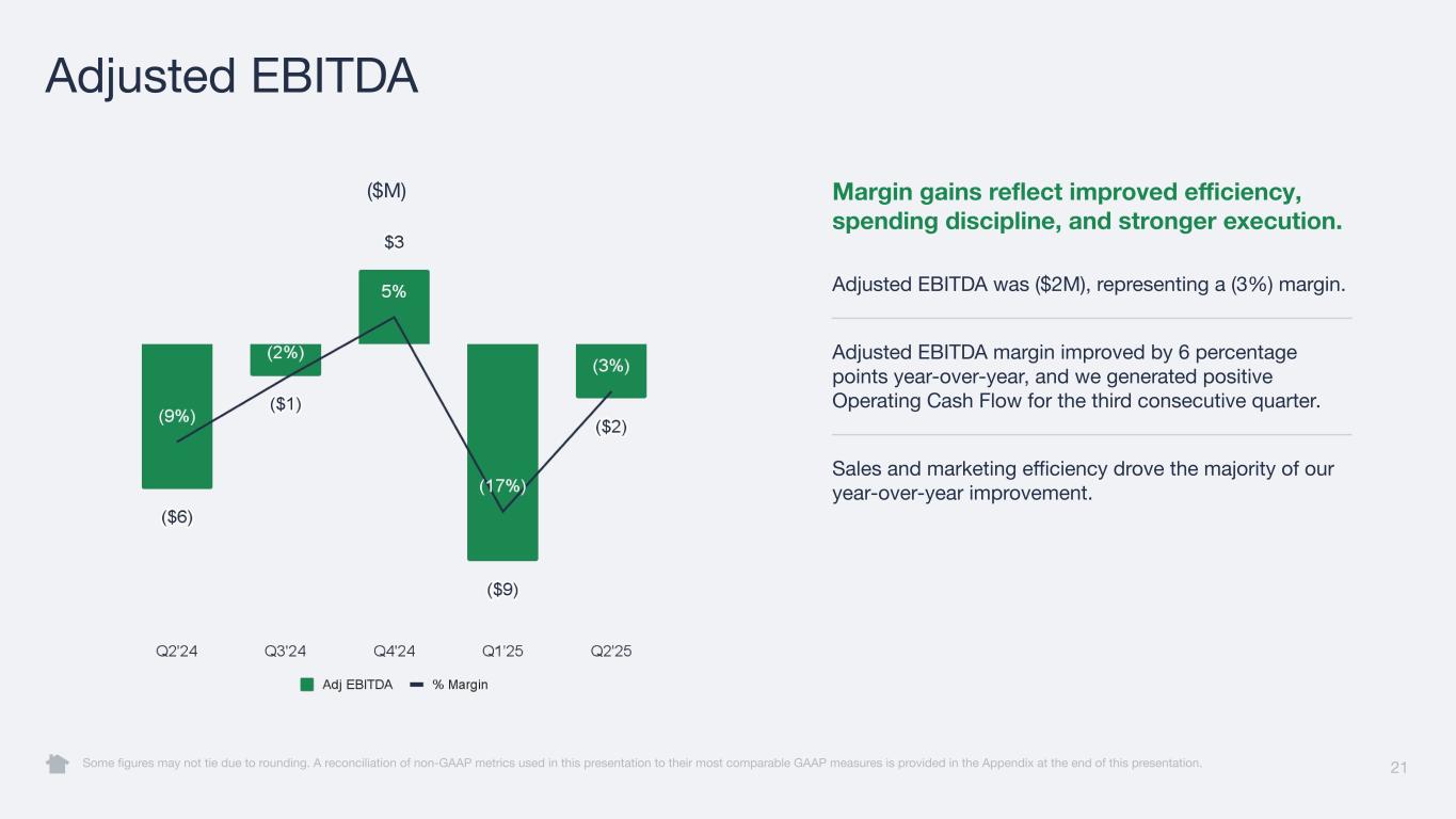 20 Net Income (Loss) Some figures may not tie due to rounding. Net loss includes restructuring costs of $26M in Q2'24. ($M) Operating leverage improved year-over-year. Net loss and margin were ($15M) and (24%), respectively. Net margin improved by 44 ppt year-over-year. Margin improvement was driven by a 24% year-over-year decline in GAAP operating expenses.