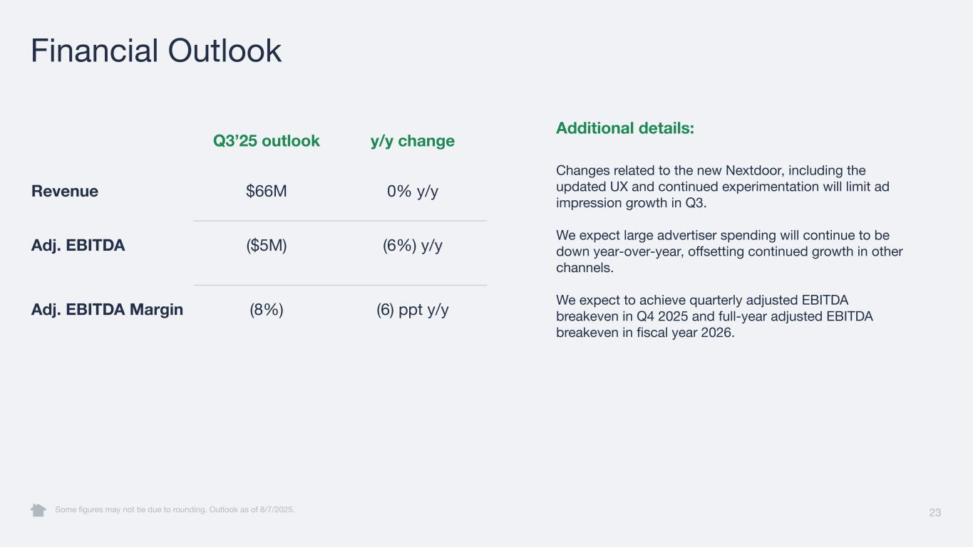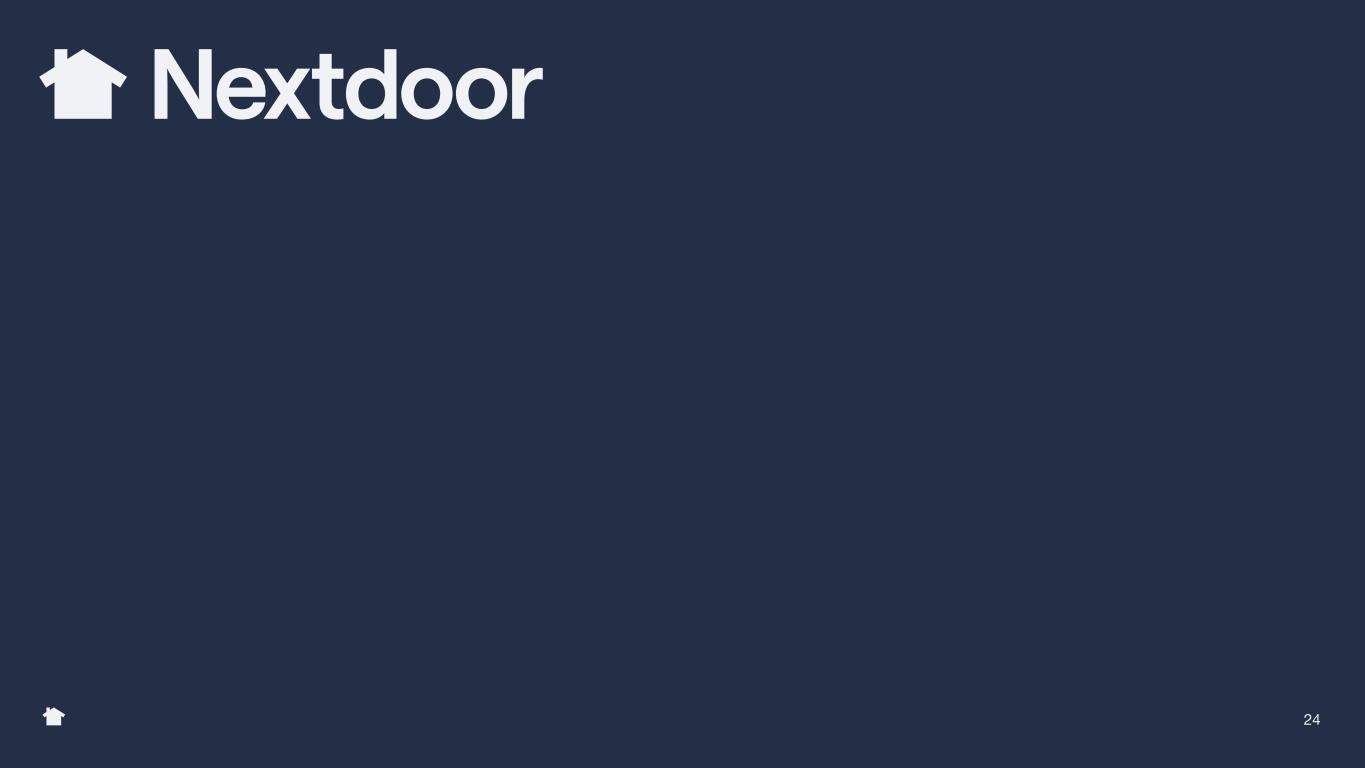 Additional details: Changes related to the new Nextdoor, including the updated UX and continued experimentation will limit ad impression growth in Q3. We expect large advertiser spending will continue to be down year-over-year, offsetting continued growth in other channels. We expect to achieve quarterly adjusted EBITDA breakeven in Q4 2025 and full-year adjusted EBITDA breakeven in fiscal year 2026. 23 Financial Outlook Some figures may not tie due to rounding. Outlook as of 8/7/2025. Q3’25 outlook y/y change Revenue $66M 0% y/y Adj. EBITDA ($5M) (6%) y/y Adj. EBITDA Margin (8%) (6) ppt y/y