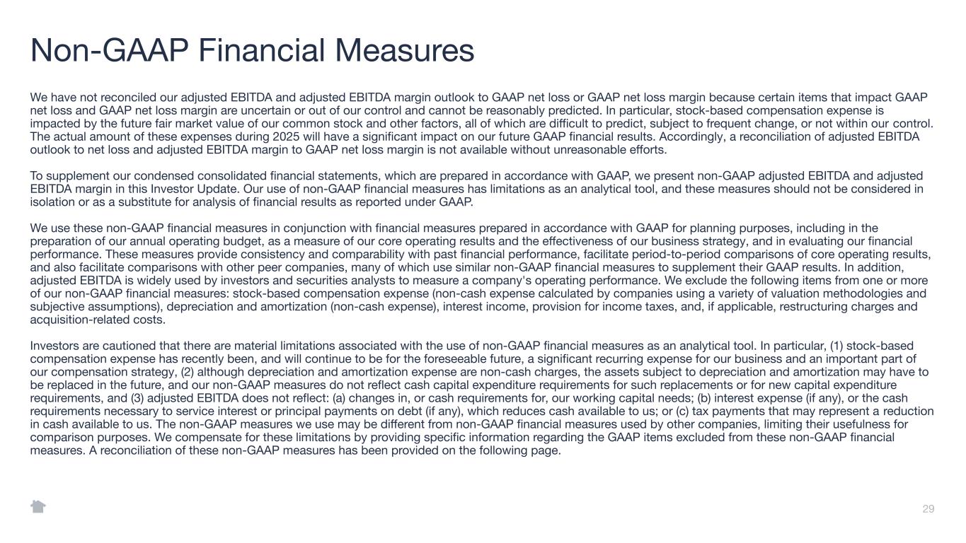 We have not reconciled our adjusted EBITDA and adjusted EBITDA margin outlook to GAAP net loss or GAAP net loss margin because certain items that impact GAAP net loss and GAAP net loss margin are uncertain or out of our control and cannot be reasonably predicted. In particular, stock-based compensation expense is impacted by the future fair market value of our common stock and other factors, all of which are difficult to predict, subject to frequent change, or not within our control. The actual amount of these expenses during 2025 will have a significant impact on our future GAAP financial results. Accordingly, a reconciliation of adjusted EBITDA outlook to net loss and adjusted EBITDA margin to GAAP net loss margin is not available without unreasonable efforts. To supplement our condensed consolidated financial statements, which are prepared in accordance with GAAP, we present non-GAAP adjusted EBITDA and adjusted EBITDA margin in this Investor Update. Our use of non-GAAP financial measures has limitations as an analytical tool, and these measures should not be considered in isolation or as a substitute for analysis of financial results as reported under GAAP. We use these non-GAAP financial measures in conjunction with financial measures prepared in accordance with GAAP for planning purposes, including in the preparation of our annual operating budget, as a measure of our core operating results and the effectiveness of our business strategy, and in evaluating our financial performance. These measures provide consistency and comparability with past financial performance, facilitate period-to-period comparisons of core operating results, and also facilitate comparisons with other peer companies, many of which use similar non-GAAP financial measures to supplement their GAAP results. In addition, adjusted EBITDA is widely used by investors and securities analysts to measure a company's operating performance. We exclude the following items from one or more of our non-GAAP financial measures: stock-based compensation expense (non-cash expense calculated by companies using a variety of valuation methodologies and subjective assumptions), depreciation and amortization (non-cash expense), interest income, provision for income taxes, and, if applicable, restructuring charges and acquisition-related costs. Investors are cautioned that there are material limitations associated with the use of non-GAAP financial measures as an analytical tool. In particular, (1) stock-based compensation expense has recently been, and will continue to be for the foreseeable future, a significant recurring expense for our business and an important part of our compensation strategy, (2) although depreciation and amortization expense are non-cash charges, the assets subject to depreciation and amortization may have to be replaced in the future, and our non-GAAP measures do not reflect cash capital expenditure requirements for such replacements or for new capital expenditure requirements, and (3) adjusted EBITDA does not reflect: (a) changes in, or cash requirements for, our working capital needs; (b) interest expense (if any), or the cash requirements necessary to service interest or principal payments on debt (if any), which reduces cash available to us; or (c) tax payments that may represent a reduction in cash available to us. The non-GAAP measures we use may be different from non-GAAP financial measures used by other companies, limiting their usefulness for comparison purposes. We compensate for these limitations by providing specific information regarding the GAAP items excluded from these non-GAAP financial measures. A reconciliation of these non-GAAP measures has been provided on the following page. 29 Non-GAAP Financial Measures