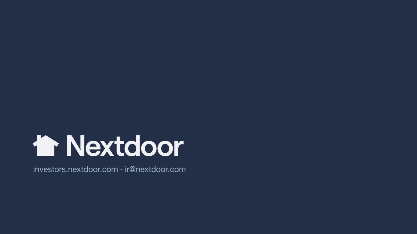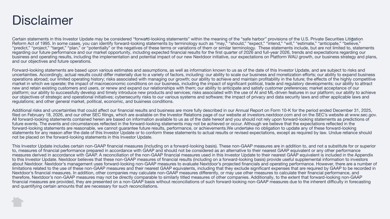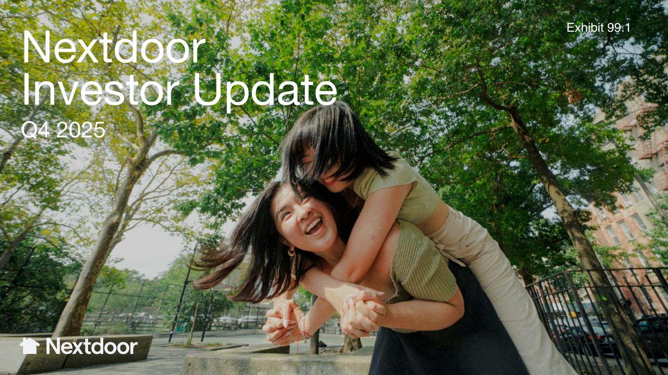 **Certain statements in this Investor Update may be considered “forward-looking statements” within the meaning of the “safe harbor” provisions of the U.S. Private Securities Litigation Reform Act of 1995. In some cases, you can identify forward-looking statements by terminology such as “may,” “should,” “expect,” “intend,” “will,” “estimate,” “anticipate,” “believe,” “predict,” “project,” “target,” “plan,” or “potentially” or the negatives of these terms or variations of them or similar terminology. These statements include, but are not limited to, statements regarding our future performance and our market opportunity, including expected financial results for the first quarter of 2026 and full-year 2026, trends and expectations regarding our business and operating results, including the implementation and potential impact of our new Nextdoor initiative, our expectations on Platform WAU growth, our business strategy and plans, and our objectives and future operations. Forward-looking statements are based upon various estimates and assumptions, as well as information known to us as of the date of this Investor Update, and are subject to risks and uncertainties. Accordingly, actual results could differ materially due to a variety of factors, including: our ability to scale our business and monetization efforts; our ability to expand business operations abroad; our limited operating history; risks associated with managing our growth; our ability to achieve and maintain profitability in the future; the effects of the highly competitive market in which we operate; the impact of macroeconomic conditions on our business, including the impact of significant political, trade and regulatory developments; our ability to attract new and retain existing customers and users, or renew and expand our relationships with them; our ability to anticipate and satisfy customer preferences; market acceptance of our platform; our ability to successfully develop and timely introduce new products and services; risks associated with the use of AI and ML-driven features in our platform; our ability to achieve our objectives of strategic and operational initiatives; cybersecurity risks to our various systems and software; the impact of privacy and data security laws and other applicable laws and regulations; and other general market, political, economic, and business conditions. Additional risks and uncertainties that could affect our financial results and business are more fully described in our Annual Report on Form 10-K for the period ended December 31, 2025, filed on February 18, 2026, and our other SEC filings, which are available on the Investor Relations page of our website at investors.nextdoor.com and on the SEC’s website at www.sec.gov. All forward-looking statements contained herein are based on information available to us as of the date hereof and you should not rely upon forward-looking statements as predictions of future events. The events and circumstances reflected in the forward-looking statements may not be achieved or occur. Although we believe that the expectations reflected in the forward-looking statements are reasonable, we cannot guarantee future results, performance, or achievements.We undertake no obligation to update any of these forward-looking statements for any reason after the date of this Investor Update or to conform these statements to actual results or revised expectations, except as required by law. Undue reliance should not be placed on the forward-looking statements in this Investor Update. This Investor Update includes certain non-GAAP financial measures (including on a forward-looking basis). These non-GAAP measures are in addition to, and not a substitute for or superior to, measures of financial performance prepared in accordance with GAAP and should not be considered as an alternative to their nearest GAAP equivalent or any other performance measures derived in accordance with GAAP. A reconciliation of the non-GAAP financial measures used in this Investor Update to their nearest GAAP equivalent is included in the Appendix to this Investor Update. Nextdoor believes that these non-GAAP measures of financial results (including on a forward-looking basis) provide useful supplemental information to investors about Nextdoor. Nextdoor’s management uses forward-looking non-GAAP measures to evaluate Nextdoor’s projected financials and operating performance. However, there are a number of limitations related to the use of these non-GAAP measures and their nearest GAAP equivalents, including that they exclude significant expenses that are required by GAAP to be recorded in Nextdoor’s financial measures. In addition, other companies may calculate non-GAAP measures differently, or may use other measures to calculate their financial performance, and therefore, Nextdoor’s non-GAAP measures may not be directly comparable to similarly titled measures of other companies. Additionally, to the extent that forward-looking non-GAAP financial measures are provided, they are presented on a non-GAAP basis without reconciliations of such forward-looking non-GAAP measures due to the inherent difficulty in forecasting and quantifying certain amounts that are necessary for such reconciliations. Disclaimer