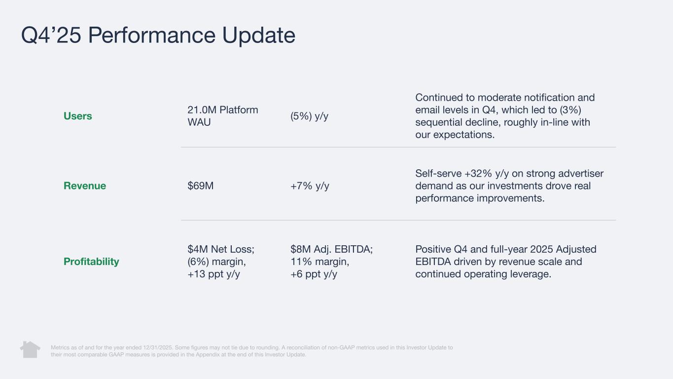 Q4’25 Performance Update Users 21.0M Platform WAU (5%) y/y Continued to moderate notification and email levels in Q4, which led to (3%) sequential decline, roughly in-line with our expectations. Revenue $69M +7% y/y Self-serve +32% y/y on strong advertiser demand as our investments drove real performance improvements. Profitability $4M Net Loss; (6%) margin, +13 ppt y/y $8M Adj. EBITDA; 11% margin, +6 ppt y/y Positive Q4 and full-year 2025 Adjusted EBITDA driven by revenue scale and continued operating leverage. Metrics as of and for the year ended 12/31/2025. Some figures may not tie due to rounding. A reconciliation of non-GAAP metrics used in this Investor Update to their most comparable GAAP measures is provided in the Appendix at the end of this Investor Update.