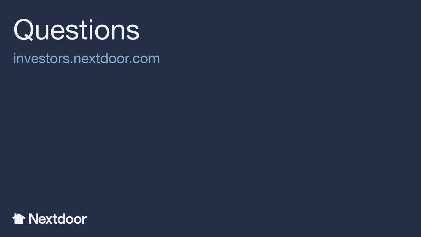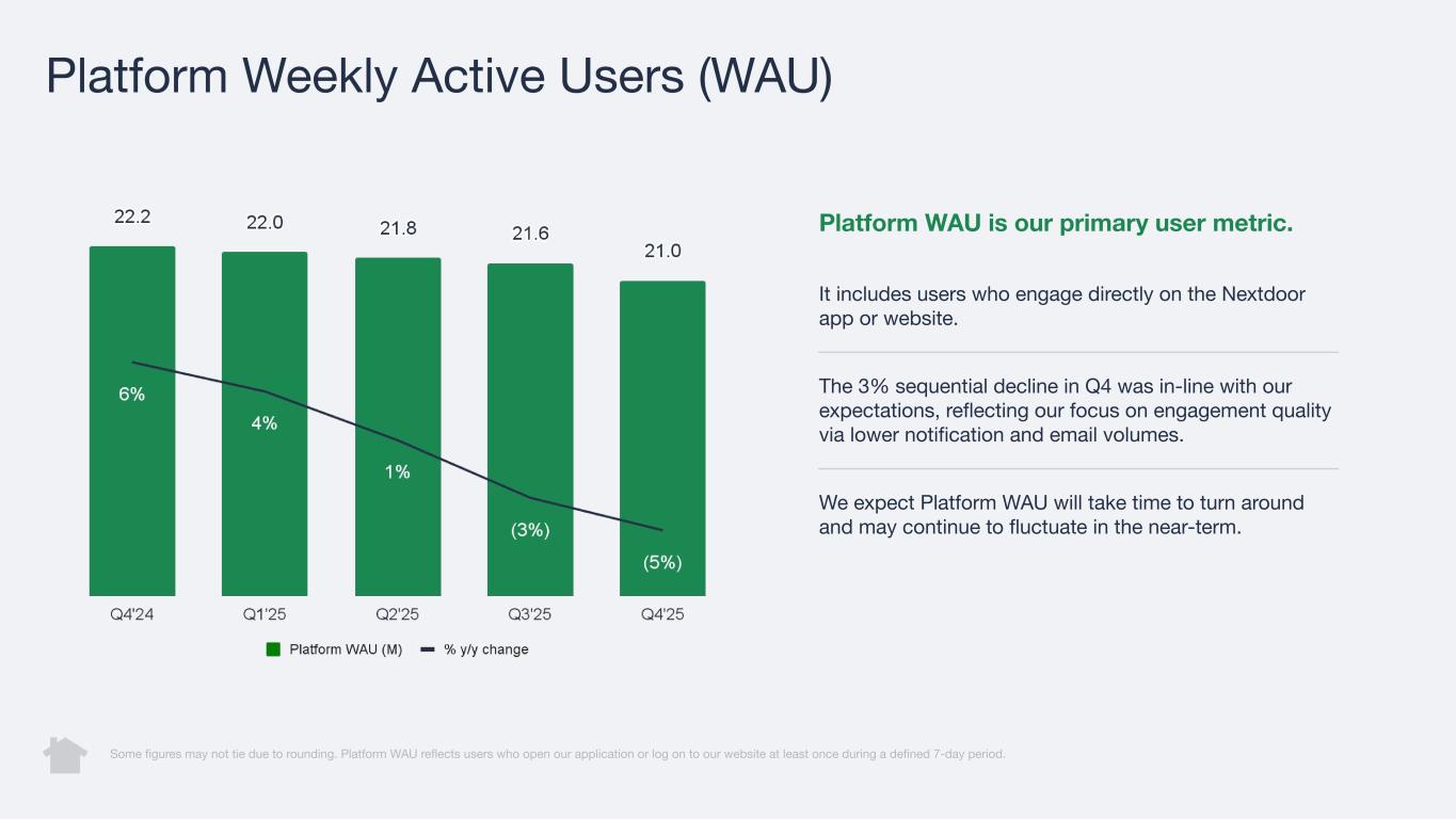 Platform Weekly Active Users (WAU) Some figures may not tie due to rounding. Platform WAU reflects users who open our application or log on to our website at least once during a defined 7-day period. Platform WAU is our primary user metric. It includes users who engage directly on the Nextdoor app or website. The 3% sequential decline in Q4 was in-line with our expectations, reflecting our focus on engagement quality via lower notification and email volumes. We expect Platform WAU will take time to turn around and may continue to fluctuate in the near-term.