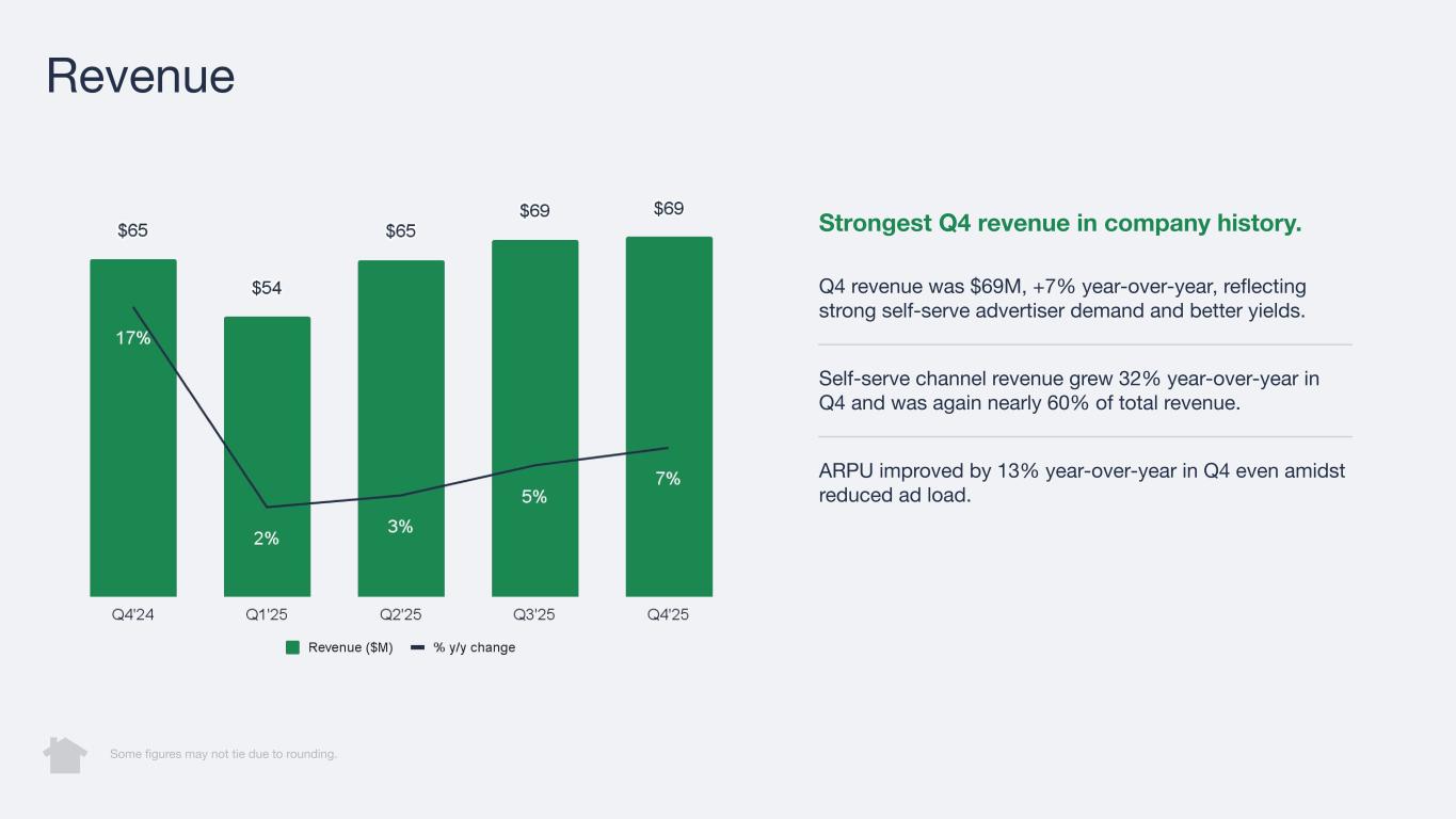 Revenue Some figures may not tie due to rounding. Strongest Q4 revenue in company history. Q4 revenue was $69M, +7% year-over-year, reflecting strong self-serve advertiser demand and better yields. Self-serve channel revenue grew 32% year-over-year in Q4 and was again nearly 60% of total revenue. ARPU improved by 13% year-over-year in Q4 even amidst reduced ad load.
