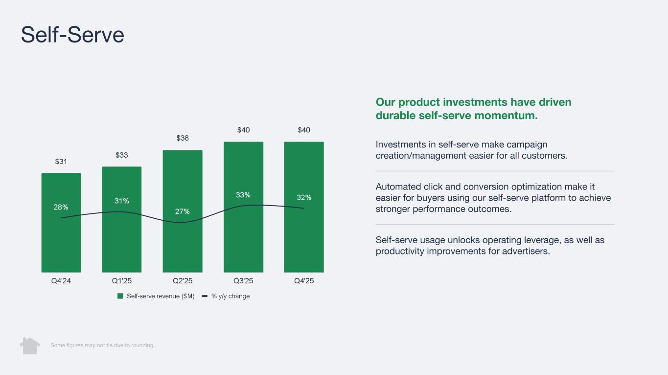 Self-Serve Some figures may not tie due to rounding. Our product investments have driven durable self-serve momentum. Investments in self-serve make campaign creation/management easier for all customers. Automated click and conversion optimization make it easier for buyers using our self-serve platform to achieve stronger performance outcomes. Self-serve usage unlocks operating leverage, as well as productivity improvements for advertisers.