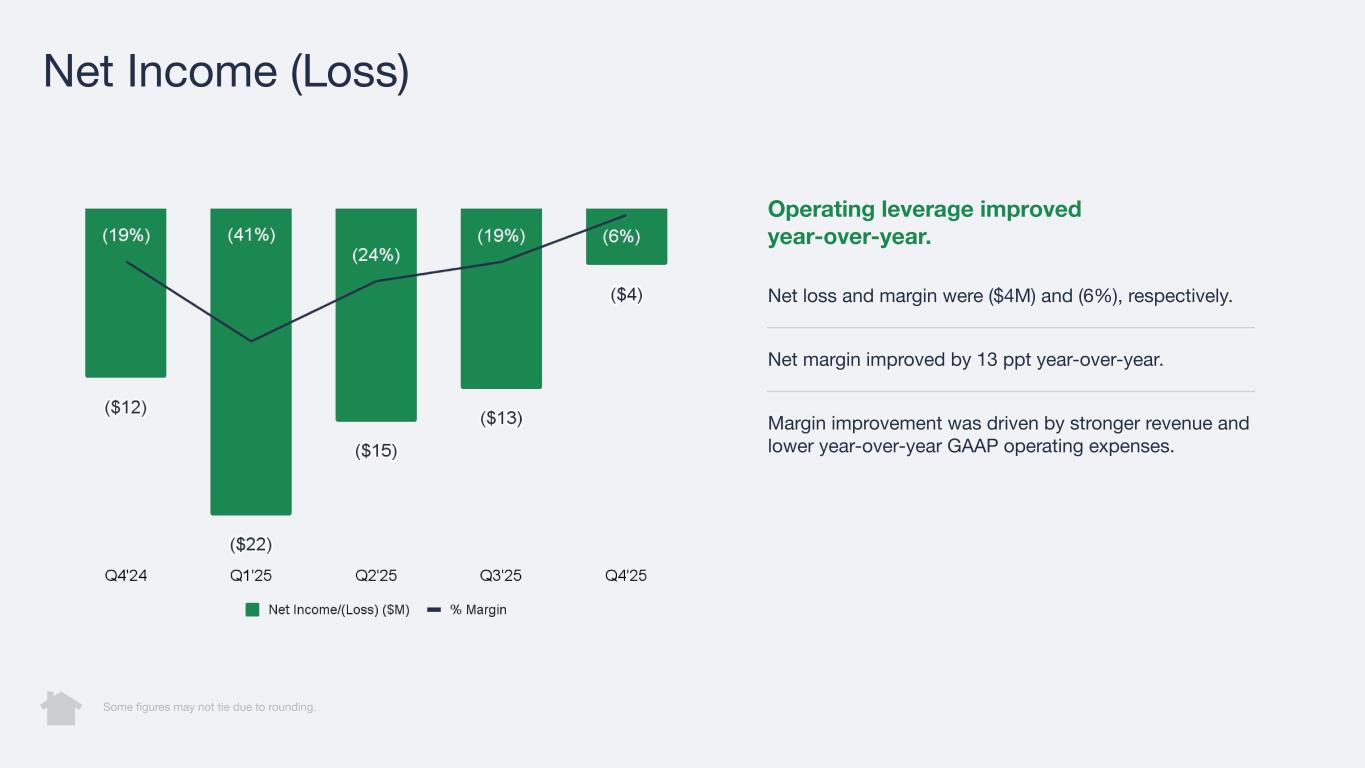 Net Income (Loss) Some figures may not tie due to rounding. Operating leverage improved year-over-year. Net loss and margin were ($4M) and (6%), respectively. Net margin improved by 13 ppt year-over-year. Margin improvement was driven by stronger revenue and lower year-over-year GAAP operating expenses.