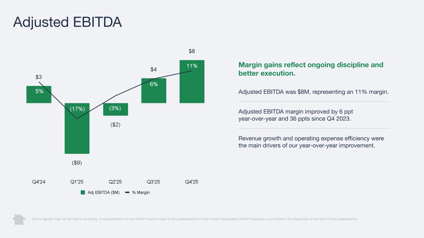Adjusted EBITDA Some figures may not tie due to rounding. A reconciliation of non-GAAP metrics used in this presentation to their most comparable GAAP measures is provided in the Appendix at the end of this presentation. Margin gains reflect ongoing discipline and better execution. Adjusted EBITDA was $8M, representing an 11% margin. Adjusted EBITDA margin improved by 6 ppt year-over-year and 36 ppts since Q4 2023. Revenue growth and operating expense efficiency were the main drivers of our year-over-year improvement.