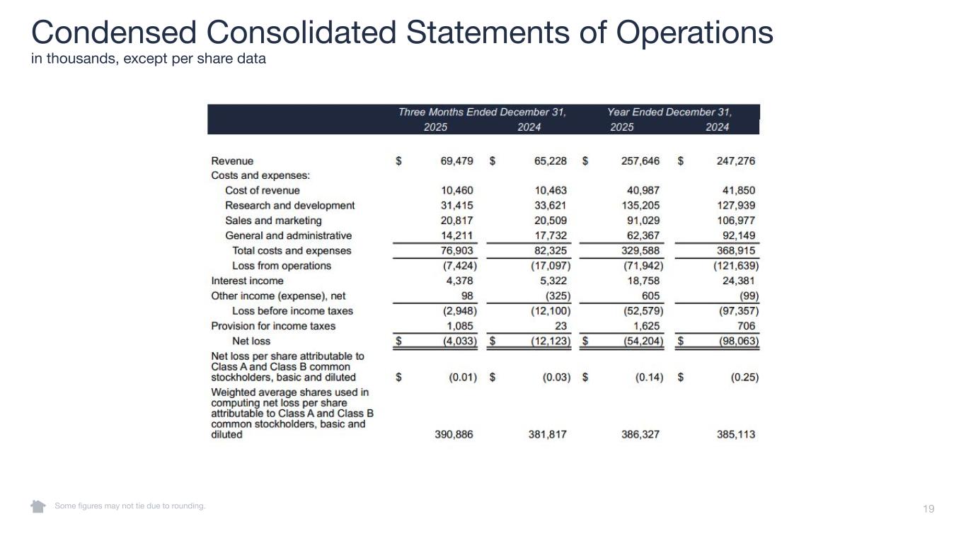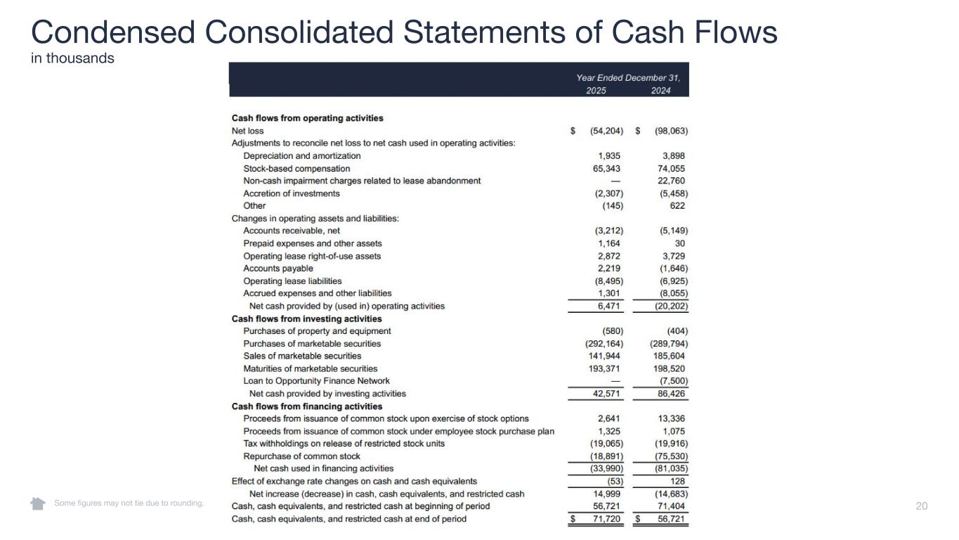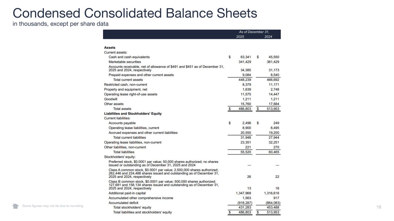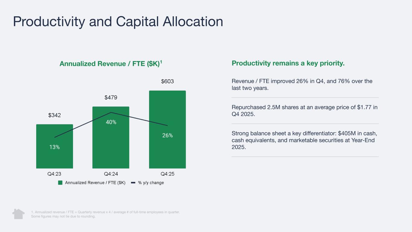 Productivity and Capital Allocation 1. Annualized revenue / FTE = Quarterly revenue x 4 / average # of full-time employees in quarter. Some figures may not tie due to rounding. Annualized Revenue / FTE ($K)1 Productivity remains a key priority. Revenue / FTE improved 26% in Q4, and 76% over the last two years. Repurchased 2.5M shares at an average price of $1.77 in Q4 2025. Strong balance sheet a key differentiator: $405M in cash, cash equivalents, and marketable securities at Year-End 2025.