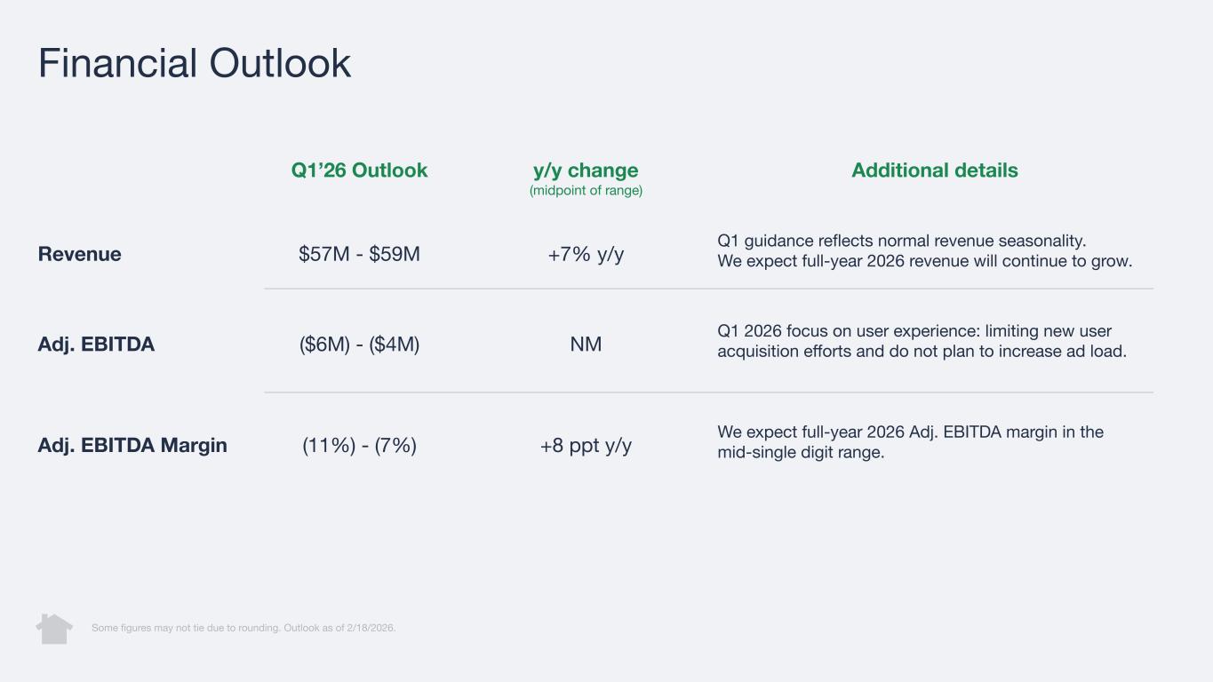 Financial Outlook Some figures may not tie due to rounding. Outlook as of 2/18/2026. Q1’26 Outlook y/y change (midpoint of range) Additional details Revenue $57M - $59M +7% y/y Q1 guidance reflects normal revenue seasonality. We expect full-year 2026 revenue will continue to grow. Adj. EBITDA ($6M) - ($4M) NM Q1 2026 focus on user experience: limiting new user acquisition efforts and do not plan to increase ad load. Adj. EBITDA Margin (11%) - (7%) +8 ppt y/y We expect full-year 2026 Adj. EBITDA margin in the mid-single digit range.