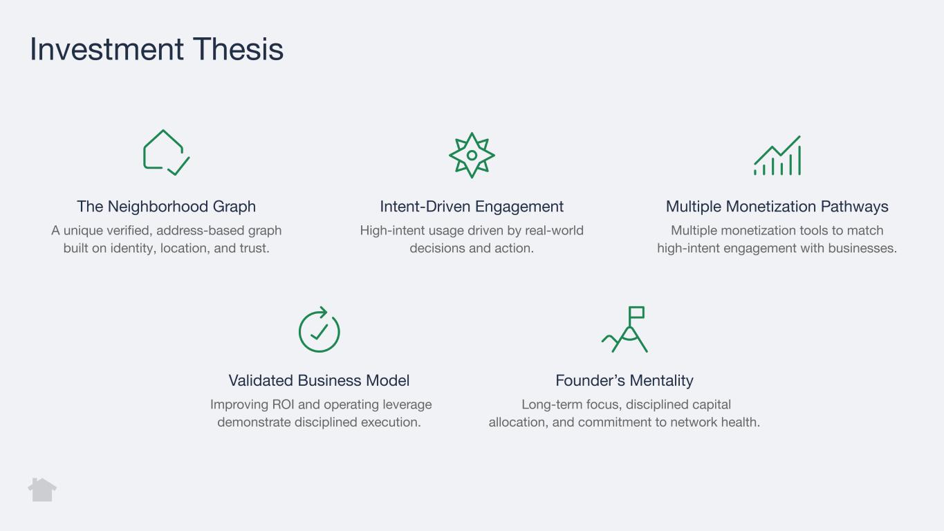 Investment Thesis The Neighborhood Graph A unique verified, address-based graph built on identity, location, and trust. Intent-Driven Engagement High-intent usage driven by real-world decisions and action. Multiple Monetization Pathways Multiple monetization tools to match high-intent engagement with businesses. Validated Business Model Improving ROI and operating leverage demonstrate disciplined execution. Founder’s Mentality Long-term focus, disciplined capital allocation, and commitment to network health.
