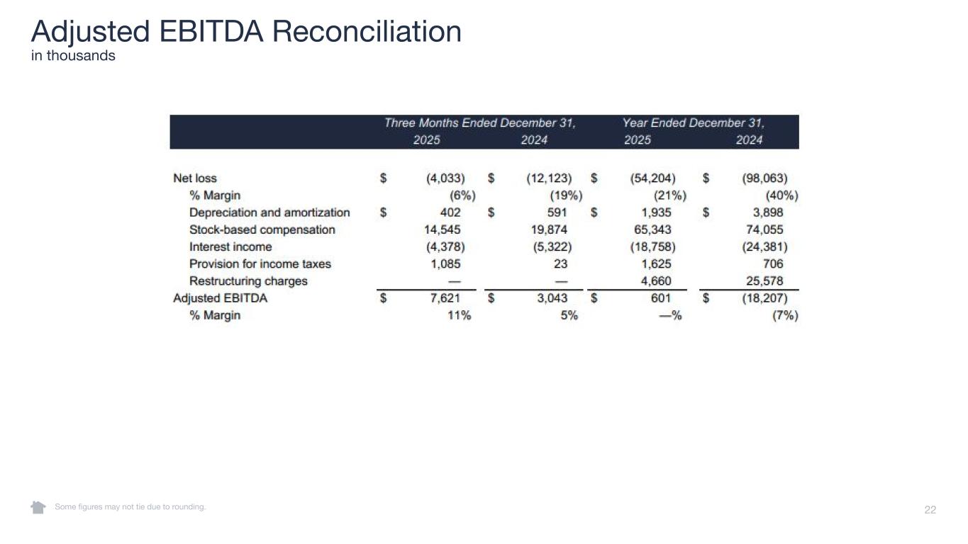 We have not reconciled our adjusted EBITDA and adjusted EBITDA margin outlook to GAAP net loss or GAAP net loss margin because certain items that impact GAAP net loss and GAAP net loss margin are uncertain or out of our control and cannot be reasonably predicted. In particular, stock-based compensation expense is impacted by the future fair market value of our common stock and other factors, all of which are difficult to predict, subject to frequent change, or not within our control. The actual amount of these expenses during 2026 will have a significant impact on our future GAAP financial results. Accordingly, a reconciliation of adjusted EBITDA outlook to net loss and adjusted EBITDA margin to GAAP net loss margin is not available without unreasonable efforts. To supplement our condensed consolidated financial statements, which are prepared in accordance with GAAP, we present non-GAAP adjusted EBITDA and adjusted EBITDA margin in this Investor Update. Our use of non-GAAP financial measures has limitations as an analytical tool, and these measures should not be considered in isolation or as a substitute for analysis of financial results as reported under GAAP. We use these non-GAAP financial measures in conjunction with financial measures prepared in accordance with GAAP for planning purposes, including in the preparation of our annual operating budget, as a measure of our core operating results and the effectiveness of our business strategy, and in evaluating our financial performance. These measures provide consistency and comparability with past financial performance, facilitate period-to-period comparisons of core operating results, and also facilitate comparisons with other peer companies, many of which use similar non-GAAP financial measures to supplement their GAAP results. In addition, adjusted EBITDA is widely used by investors and securities analysts to measure a company's operating performance. We exclude the following items from one or more of our non-GAAP financial measures: stock-based compensation expense (non-cash expense calculated by companies using a variety of valuation methodologies and subjective assumptions), depreciation and amortization (non-cash expense), interest income, provision for income taxes, and, if applicable, restructuring charges and acquisition-related costs. Investors are cautioned that there are material limitations associated with the use of non-GAAP financial measures as an analytical tool. In particular, (1) stock-based compensation expense has recently been, and will continue to be for the foreseeable future, a significant recurring expense for our business and an important part of our compensation strategy, (2) although depreciation and amortization expense are non-cash charges, the assets subject to depreciation and amortization may have to be replaced in the future, and our non-GAAP measures do not reflect cash capital expenditure requirements for such replacements or for new capital expenditure requirements, and (3) adjusted EBITDA does not reflect: (a) changes in, or cash requirements for, our working capital needs; (b) interest expense (if any), or the cash requirements necessary to service interest or principal payments on debt (if any), which reduces cash available to us; or (c) tax payments that may represent a reduction in cash available to us. The non-GAAP measures we use may be different from non-GAAP financial measures used by other companies, limiting their usefulness for comparison purposes. We compensate for these limitations by providing specific information regarding the GAAP items excluded from these non-GAAP financial measures. A reconciliation of these non-GAAP measures has been provided on the following page. 21 Non-GAAP Financial Measures