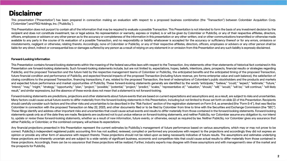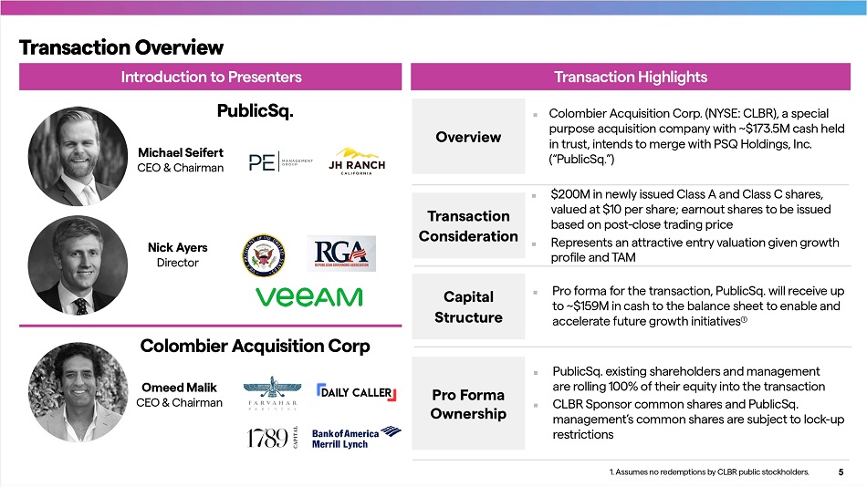 Additional Information and Where to Find It In connection with the proposed Transaction, on April 7 , 2023 , Colombier filed a registration statement on Form S - 4 with the SEC, which was subsequently amended on May 22 , 2023 , and which included a preliminary prospectus with respect to its securities to be issued in connection with the proposed Transaction and a preliminary proxy statement with respect to a stockholder meeting at which Colombier’s stockholders will be asked to vote on the proposed Transaction . Colombier and PublicSq . urge investors, stockholders, and other interested persons to read the Form S - 4 , including the proxy statement/prospectus, any amendments thereto, and any other documents filed with the SEC, before making any voting or investment decision because these documents do or will contain impo r tant information about the proposed Transaction . After the Form S - 4 has been declared effective, Colombier will mail the definitive proxy statement/prospectus to stockholders of Colombier as of a record date to be established for voting on the proposed Transaction . Colombier’s stockholders will also be able to obtain a copy of such documents, without charge, by directing a request to : Colombier Acquisition Corp . , 214 Brazilian Avenue, Suite 200 - A, Palm Beach, FL 33480 ; e - mail : ir@colombierspac . com . These documents, including the Form S - 4 , and other documents once available, can also be obtained, without charge, at the SEC’s website www . sec . gov . Pa r ticipants in the Solicitation Colombier and its directors and officers may be deemed pa r ticipants in the solicitation of proxies of Colombier’s shareholders in connection with the proposed Transaction . Security holders may obtain more detailed information regarding the names, affiliations, and interests of ce r tain of Colombier’s executive officers and directors in the solicitation by reading Colombier’s final prospectus filed with the SEC on June 9 , 2021 , and the Form S - 4 , as amended, filed with the SEC on May 22 , 2023 , and the proxy statement/prospectus and other relevant materials filed with the SEC in connection with the Transaction when they become available . Information concerning the interests of Colombier’s pa r ticipants in the solicitation, which may, in some cases, be different from those of their shareholders generally, are set fo r th in the Form S - 4 , and preliminary proxy statement/prospectus relating to the Transaction now available as mentioned above . These documents can be obtained free of charge from the source indicated above . PublicSq . and its directors and executive officers may also be deemed to be pa r ticipants in the solicitation of proxies from the shareholders of Colombier in connection with the proposed Transaction . A list of the names of such directors and executive officers and information regarding their interests in the proposed Transaction are included in the Form S - 4 and preliminary proxy statement/ prospectus for the proposed Transaction . No Offer or Solicitation Neither the dissemination of this Presentation nor any pa r t of its contents are to be taken as any form of commitment on the pa r t of Colombier or PublicSq . or any of their respective affiliates to enter any contract or otherwise create any legally binding obligation or commitment . This Presentation does not constitute or form pa r t of any offer or invitation to sell, or any solicitation of any offer to purchase any interests in Colombier or PublicSq . , nor shall it or any pa r t of it or the fact of its distribution form the basis of, or be relied on in connection with, any contract or commitment or investment decisions relating thereto, nor does it constitute a recommendation regarding the interests in Colombier or PublicSq . No securities commission or regulatory authority in the United States or in any other country has in any way opined upon the accuracy or adequacy of this Presentation or the materials contained herein . This Presentation is not, and under no circumstances is to be construed as, a prospectus, a public offering or an offering memorandum as defined under applicable securities laws and shall not form the basis of any contract . 4 Disclaimer