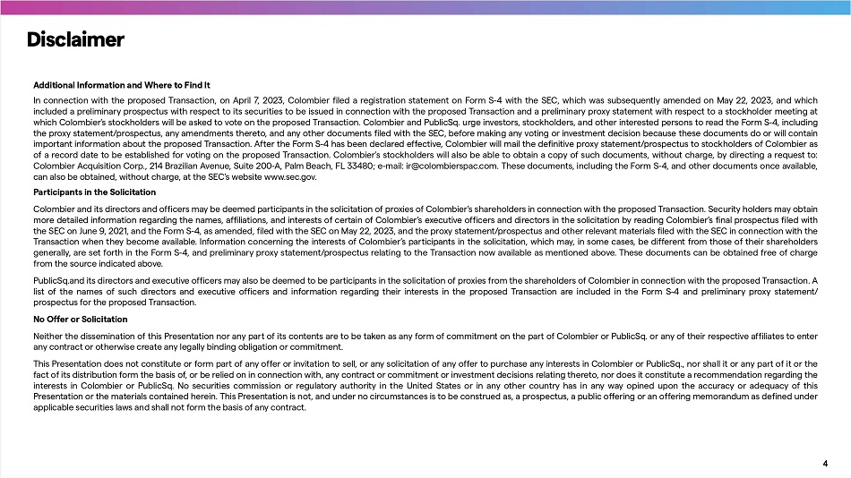 While the information contained in this Presentation is believed to be accurate, no representation or warranty is given or made, express or implied, as to the achievement, reasonableness, completeness or accuracy of, and no reliance should be placed on, any projections, estimates, forecasts, analyses or forward looking statements contained in this Presentation which involve by their nature a number of risks, unce r tainties or assumptions that could cause actual results or events to differ materially from those expressed or implied in this Presentation . Only those pa r ticular representations and warranties made in a definitive written agreement and subject to such limitations and restrictions as may be specified in such agreement, shall have any legal effect . By its acceptance hereof, each recipient of this Presentation agrees that neither Colombier nor PublicSq . shall be liable for any direct, indirect, consequential or any other loss or damages suffered by any person as a result of relying on any statement in or omission from this Presentation, along with other information furnished in connection therewith, and any such liability is expressly disclaimed . Ce r tain Assumptions Unless otherwise expressly stated herein, all information relating to the proposed Transaction : (i) assumes no redemptions by Colombier stockholders in connection with the Transaction ; (ii) does not give effect to any PIPE or other financing that may be raised in connection with or in anticipation of the Transaction ; (iii) does not assume the future exercise of or otherwise give effect to Colombier's outstanding warrants held by public investors or Colombier's sponsor, (iv) assumes that no additional shares of common stock will be issued in the future as earnout merger consideration in connection with the Transaction ; and (iv) does not give effect to future equity awards contemplated to be issued in connection with or following completion of the Transaction . Industry and Market Data The information contained herein also includes information provided by third pa r ties, such as market research firms . None of Colombier, PublicSq . or their respective affiliates and any third pa r ties that provide information to Colombier or PublicSq . , such as market research firms, guarantee the accuracy, completeness, timeliness or availability of any information . None of Colombier, PublicSq . or their respective affiliates and any third pa r ties that provide information to Colombier or PublicSq . , such as market research firms, are responsible for any errors or omissions (negligent or otherwise), regardless of the cause, or the results obtained from the use of such content . None of Colombier, PublicSq . or their respective affiliates give any express or implied warranties, including, but not limited to, any warranties of merchantability or fitness for a pa r ticular purpose or use, or non - infringement, and they expressly disclaim any responsibility or liability for direct, indirect, incidental, exemplary, compensatory, punitive, special or consequential damages, costs, expenses, legal fees or losses (including lost income or profits and oppo r tunity costs) in connection with the use of the information herein . Trademarks and Intellectual Prope r ty All trademarks, service marks, and trade names of PublicSq . or Colombier or their respective affiliates used herein are trademarks, service marks, or registered trade names of PublicSq . or Colombier, respectively, as noted herein . Any other product, company names, or logos mentioned herein are the trademarks and/or intellectual prope r ty of their respective owners, and their use is not alone intended to, and does not alone imply, a relationship with PublicSq . or Colombier, or an endorsement or sponsorship by or of PublicSq . or Colombier . Solely for convenience, the trademarks, service marks and trade names referred to in this Presentation may appear without the ®, TM or SM symbols, but such references are not intended to indicate, in any way, that PublicSq . , Colombier or the applicable rights owner will not asse r t, to the fullest extent under applicable law, their rights or the right of the applicable licensor to these trademarks, service marks and trade names . 3 Disclaimer