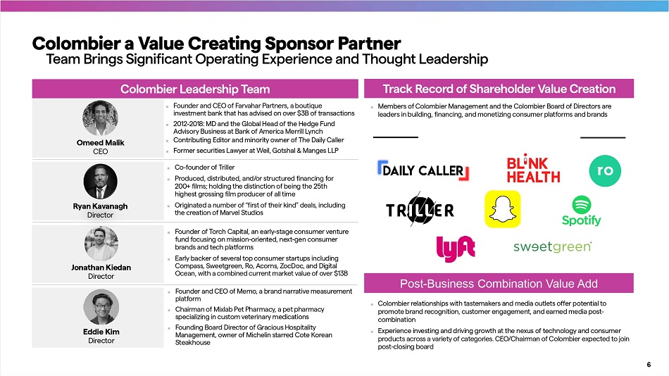 Introduction to Presenters Transaction Highlights Transaction Overview 1. Assumes no redemptions by CLBR public stockholders. Colombier Acquisition Corp Michael Seife r t CEO & Chairman PublicSq. ▪ Colombier Acquisition Corp. (NYSE: CLBR), a special purpose acquisition company with ~$173.5M cash held in trust, intends to merge with PSQ Holdings, Inc. (“PublicSq.”) Ȼ ▪ $200M in newly issued Class A and Class C shares, valued at $10 per share; earnout shares to be issued based on post - close trading price Represents an attractive entry valuation given growth profile and TAM ▪ Pro forma for the transaction, PublicSq . will receive up to ~ $ 159 M in cash to the balance sheet to enable and accelerate future growth initiatives Ȋ Ȼ Ȼ PublicSq. existing shareholders and management are rolling 100% of their equity into the transaction CLBR Sponsor common shares and PublicSq. management’s common shares are subject to lock - up restrictions 5 Nick Ayers Director Omeed Malik CEO & Chairman Overview Transaction Consideration Capital Structure Pro Forma Ownership