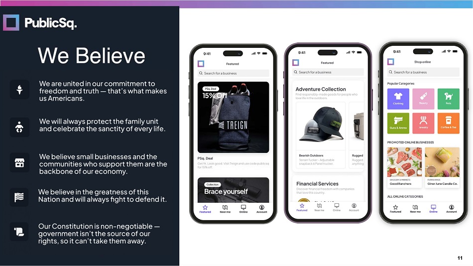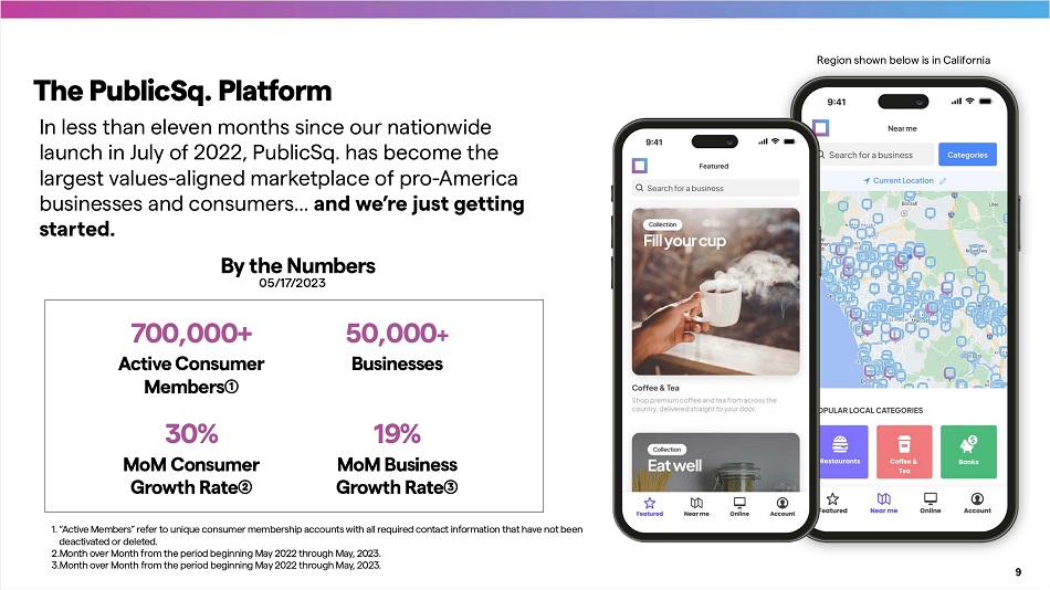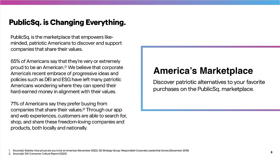 1. Source(s): Statista: How proud are you to be an American (November 2022), GS Strategy Group: Responsible Corporate Leadership Survey (December 2019) 2. Source(s): 5W Consumer Culture Repo r t (2020) PublicSq. is the marketplace that empowers like - minded, patriotic Americans to discover and suppo r t companies that share their values. 65% of Americans say that they’re very or extremely proud to be an American. Ȋ We believe that corporate America’s recent embrace of progressive ideas and policies such as DEI and ESG have left many patriotic Americans wondering where they can spend their hard - earned money in alignment with their values. 71% of Americans say they prefer buying from companies that share their values. ȋ Through our app and web experiences, customers are able to search for, shop, and share these freedom - loving companies and products, both locally and nationally. America’s Marketplace Discover patriotic alternatives to your favorite purchases on the PublicSq. marketplace. PublicSq. is Changing Everything. 8