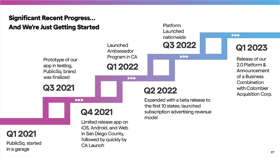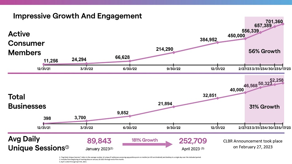 3,700 9,852 21,894 32,851 40,000 46,568 50,323 52,258 Total Businesses 398 Impressive Growth And Engagement Active Consumer Members 89,843 January 2023 (2) 252,709 April 2023 (3) 1. “Avg Daily Unique Sessions” refers to the average number of unique IP addresses accessing app.publicsq.com on mobile (on iOS and Android) and desktop in a single day over the indicated period. 2. Includes from beginning of tracking data on January 18 2023 through end of the month. 3. April 1 2023 through April 30, 2023. 181% Growth 31% Growth 12/31/21 Avg Daily Unique Sessions ༃ 56% Growth CLBR Announcement took place on February 27, 2023 12/31/21 3/31/22 6/30/22 9/30/22 12/31/22 2/27/23 3/31/234/30/235/17/23 3/31/22 6/30/22 9/30/22 12/31/22 2/27/23 3/31/234/30/235/17/23 11,256 24,294 66,628 214,290 384,952 450,000 556,339 657,389 701,360