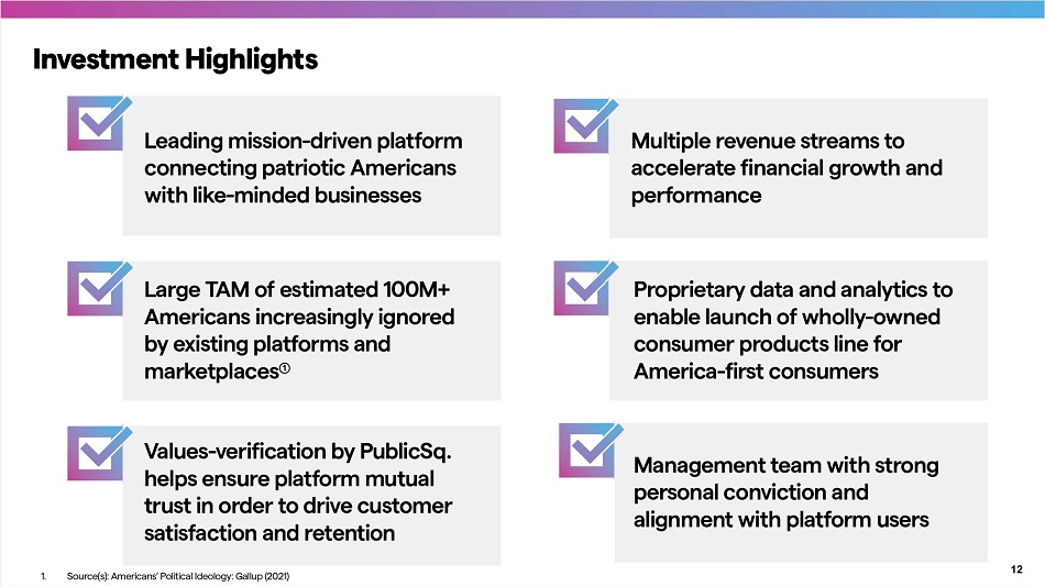 Leading mission - driven platform connecting patriotic Americans with like - minded businesses 1. Source(s): Americans’ Political Ideology: Gallup (2021) Investment Highlights Large TAM of estimated 100M+ Americans increasingly ignored by existing platforms and marketplaces ༃ Values - verification by PublicSq. helps ensure platform mutual trust in order to drive customer satisfaction and retention Multiple revenue streams to accelerate financial growth and performance Proprietary data and analytics to enable launch of wholly - owned consumer products line for America - first consumers Management team with strong personal conviction and alignment with platform users 12