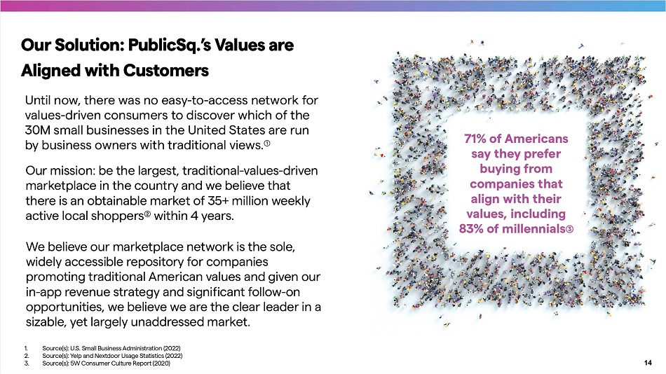 1. Based on the latest private market valuation shown by PitchBook as of February 24, 2023 Progressive Priorities Traditional, Pro - America Values 13 $958B Mkt Cap $15.4B Mkt Cap $650MM ༃ Mkt Cap $2.5B Mkt Cap $2B Mkt Cap Disconnect Between the Values of Large Corporations and Patriotic Consumers Creates Significant Market Opportunity Serving an Unaddressed Market