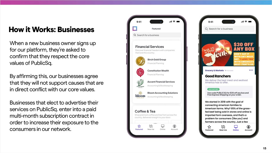 Until now, there was no easy - to - access network for values - driven consumers to discover which of the 30M small businesses in the United States are run by business owners with traditional views. Ȋ Our mission: be the largest, traditional - values - driven marketplace in the country and we believe that there is an obtainable market of 35+ million weekly active local shoppers ȋ within 4 years. 1. Source(s): U.S. Small Business Administration (2022) 2. Source(s): Yelp and Nextdoor Usage Statistics (2022) 3. Source(s): 5W Consumer Culture Repo r t (2020) 71% of Americans say they prefer buying from companies that align with their values, including 83% of millennials ¤ We believe our marketplace network is the sole, widely accessible repository for companies promoting traditional American values and given our in - app revenue strategy and significant follow - on oppo r tunities, we believe we are the clear leader in a sizable, yet largely unaddressed market. Our Solution: PublicSq.’s Values are Aligned with Customers 14