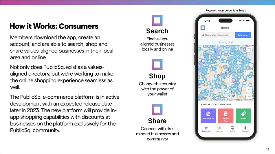 Members download the app, create an account, and are able to search, shop and share values - aligned businesses in their local area and online. Not only does PublicSq. exist as a values - aligned directory, but we’re working to make the online shopping experience seamless as well. The PublicSq. e - commerce platform is in active development with an expected release date later in 2023. The new platform will provide in - app shopping capabilities with discounts at businesses on the platform exclusively for the PublicSq. community. How it Works: Consumers Search Find values - aligned businesses locally and online Shop Change the country with the power of your wallet Share Connect with like - minded businesses and community Region shown below is in Texas 16