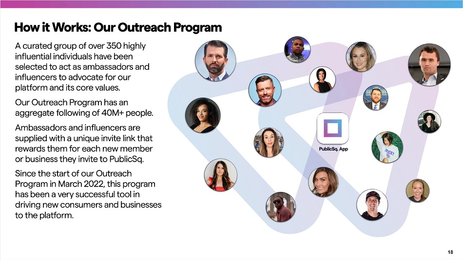 A curated group of over 350 highly influential individuals have been selected to act as ambassadors and influencers to advocate for our platform and its core values. Our Outreach Program has an aggregate following of 40M+ people. Ambassadors and influencers are supplied with a unique invite link that rewards them for each new member or business they invite to PublicSq. Since the sta r t of our Outreach Program in March 2022, this program has been a very successful tool in driving new consumers and businesses to the platform. 18 How it Works: Our Outreach Program