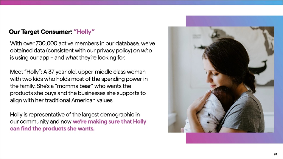 Our Target Consumer: ”Holly” With over 700,000 active members in our database, we’ve obtained data (consistent with our privacy policy) on who is using our app – and what they’re looking for. Meet “Holly”: A 37 year old, upper - middle class woman with two kids who holds most of the spending power in the family. She’s a “momma bear” who wants the products she buys and the businesses she suppo r ts to align with her traditional American values. Holly is representative of the largest demographic in our community and now we’re making sure that Holly can find the products she wants. 20