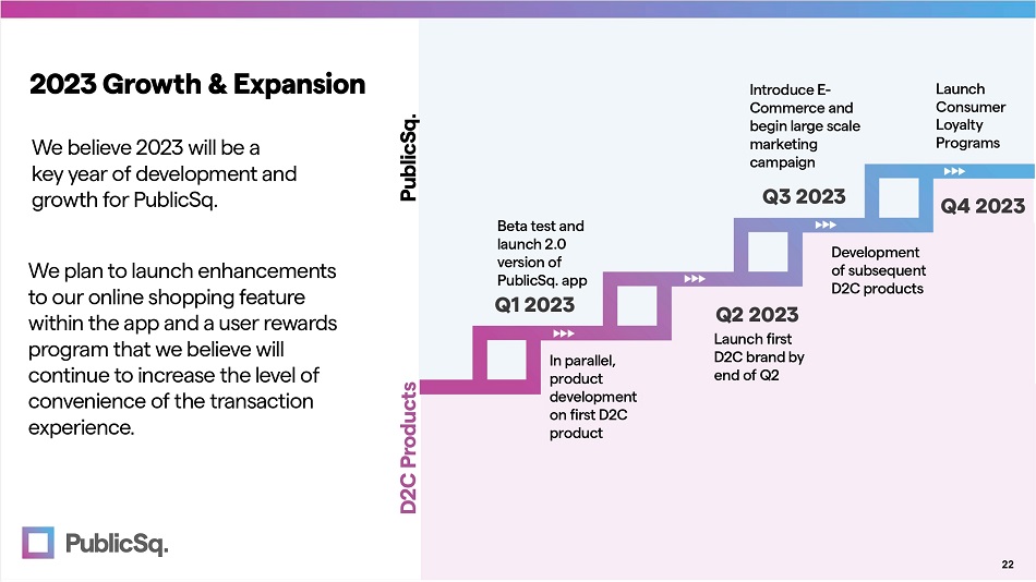We plan to launch enhancements to our online shopping feature within the app and a user rewards program that we believe will continue to increase the level of convenience of the transaction experience. D2C Products PublicSq . 2023 Growth & Expansion Q1 2023 Beta test and launch 2.0 version of PublicSq. app In parallel, product development on first D2C product Q2 2023 Launch first D2C brand by end of Q2 Q3 2023 Introduce E - Commerce and begin large scale marketing campaign Development of subsequent D2C products Launch Consumer Loyalty Programs Q4 2023 We believe 2023 will be a key year of development and growth for PublicSq. 22