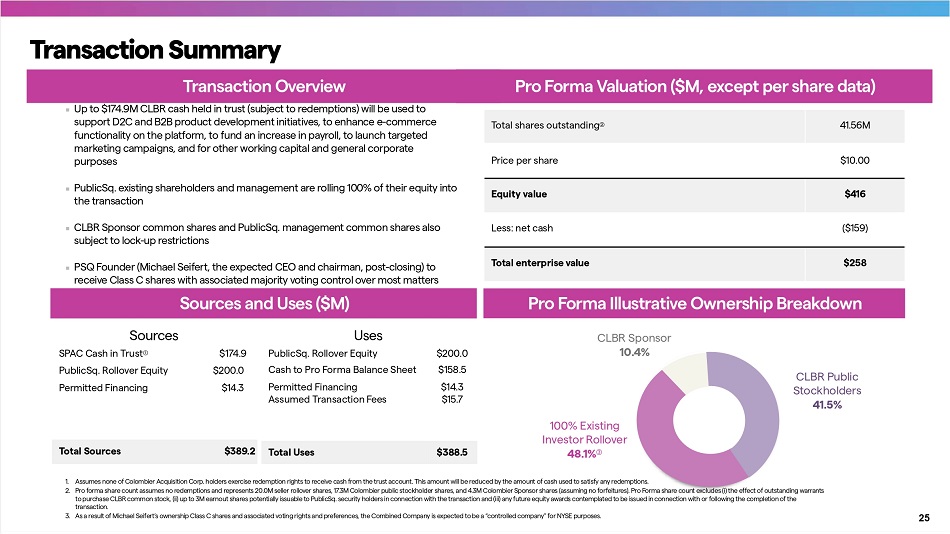 Total shares outstanding ȋ 41.56M Price per share $10.00 Equity value $416 Less: net cash ($159) Total enterprise value $258 1. Assumes none of Colombier Acquisition Corp. holders exercise redemption rights to receive cash from the trust account. This amount will be reduced by the amount of cash used to satisfy any redemptions. 2. Pro forma share count assumes no redemptions and represents 20.0M seller rollover shares, 17.3M Colombier public stockholder shares, and 4.3M Colombier Sponsor shares (assuming no forfeitures). Pro Forma share count excludes (i) the effect of outstanding warrants to purchase CLBR common stock, (ii) up to 3M earnout shares potentially issuable to PublicSq. security holders in connection with the transaction and (iii) any future equity awards contemplated to be issued in connection with or following the completion of the transaction. 3. As a result of Michael Seife r t’s ownership Class C shares and associated voting rights and preferences, the Combined Company is expected to be a “controlled company” for NYSE purposes. ▪ Up to $174.9M CLBR cash held in trust (subject to redemptions) will be used to suppo r t D2C and B2B product development initiatives, to enhance e - commerce functionality on the platform, to fund an increase in payroll, to launch targeted marketing campaigns, and for other working capital and general corporate purposes ▪ PublicSq. existing shareholders and management are rolling 100% of their equity into the transaction ▪ CLBR Sponsor common shares and PublicSq. management common shares also subject to lock - up restrictions ▪ PSQ Founder (Michael Seife r t, the expected CEO and chairman, post - closing) to receive Class C shares with associated majority voting control over most matters submitted for stockholder approval. Total Sources $389.2 Total Uses $388.5 100% Existing Investor Rollover 48.1% Ȍ CLBR Public Stockholders 41.5% Sources SPAC Cash in Trust Ȋ $174.9 Uses PublicSq. Rollover Equity $200.0 CLBR Sponsor 10.4% PublicSq. Rollover Equity $200.0 Cash to Pro Forma Balance Sheet $158.5 Permitted Financing $14.3 Permitted Financing $14.3 Assumed Transaction Fees $15.7 Transaction Summary 25 Transaction Overview Pro Forma Valuation ($M, except per share data) Sources and Uses ($M) Pro Forma Illustrative Ownership Breakdown