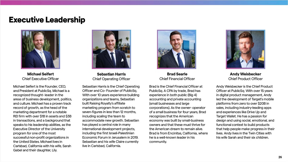 Michael Seife r t Chief Executive Officer Michael Seife r t is the Founder, CEO, and President at PublicSq. Michael is a recognized thought - leader in the areas of business development, politics, and culture. Michael has a proven track record of growth, as the head of the marketing depa r tment for a notable REI firm with over $1B in assets and $3B in transactions, and a background that speaks to his leadership abilities, as the Executive Director of the University program for one of the most successful non - profit organizations in the United States. Michael lives in Carlsbad, California with his wife, Sarah Gabel and their daughter, Lily. Executive Leadership Sebastian Harris Chief Operating Officer Sebastian Harris is the Chief Operating Officer and Co - Founder of PublicSq. With over 10 years experience building organizations and teams, Sebastian built Raising Royalty's affiliate marketing program from scratch to seven - figures in less than 12 months, including scaling the team to accommodate new growth. Sebastian has played a central role in many international development projects, including the first Israeli - Palestinian Economic Forum in Jerusalem in 2019. Sebastian and his wife Claire currently live in Carlsbad, California. 26 Brad Searle Chief Financial Officer Brad is the Chief Financial Officer at PublicSq. A CPA by trade, Brad has experience in both public (Big 4) accounting and private accounting (small businesses and large corporations). As the owner - operator of a small business for four years, Brad recognizes that the American economy was built by small - business owners and that these must thrive for the American dream to remain alive. Brad is from Encinitas, California, where he is a well - known leader in his community. Andy Weisbecker Chief Product Officer Andy Weisbecker is the Chief Product Officer at PublicSq. With over 15 years in digital product management, Andy led the development of Target’s mobile platforms from zero to over $20B in sales, including industry - leading apps and experiences like Drive Up and Target Wallet. He has a passion for design and using social, emotional, and functional context to build products that help people make progress in their lives. Andy lives in the Twin Cities with his wife Sarah and their six children.