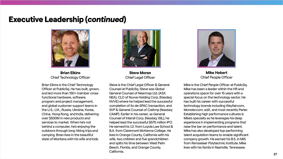 Executive Leadership ( continued ) Brian Elkins Chief Technology Officer Brian Elkins is the Chief Technology Officer at PublicSq. He has built, grown, and led more than 150+ member cross - functional hardware, software, program and project management, and global customer suppo r t teams in the U.S., U.K., Russia, Ukraine, Korea, China, Hong Kong, and India, delivering over $500M in new products and services to market. When he’s not behind a computer, he’s enjoying the outdoors through long hiking trips and camping. Brian lives in the beautiful state of Montana with his wife and kids. Steve Moran Chief Legal Officer Steve is the Chief Legal Officer & General Counsel at PublicSq. Steve was Global General Counsel of Nearmap Ltd. (ASX: NEA), CLO of Nuvve Holding Corp. (Nasdaq: NVVE) where he helped lead the successful completion of its de - SPAC transaction, and SVP & General Counsel of CalAmp (Nasdaq: CAMP). Earlier in his career, as General Counsel of Intersil Corp. (Nasdaq: ISIL), he helped lead the successful $575 million IPO. He earned his J.D. from Loyola Law School & B.A. from Claremont McKenna College. He lives in Orange County, California with his wife, two children and five grandchildren and splits his time between West Palm Beach, Florida, and Orange County, California. Mike Hebe r t Chief People Officer Mike is the Chief People Officer at PublicSq. Mike has been a leader within the HR and operations space for over 15 years with a special focus on the technology sector. He has built his career with successful technology brands including Wayfair.com, Monster.com, edX, and most recently Parler. Establishing high performance cultures is Mike’s specialty as he leverages his deep experience in implementing programs that raise the bar on performance and talent. Mike has also developed top - performing talent acquisition teams to enable significant company growth. He earned his B.S. in MIS from Rensselaer Polytechnic Institute. Mike lives with his family in Nashville, Tennessee. 27