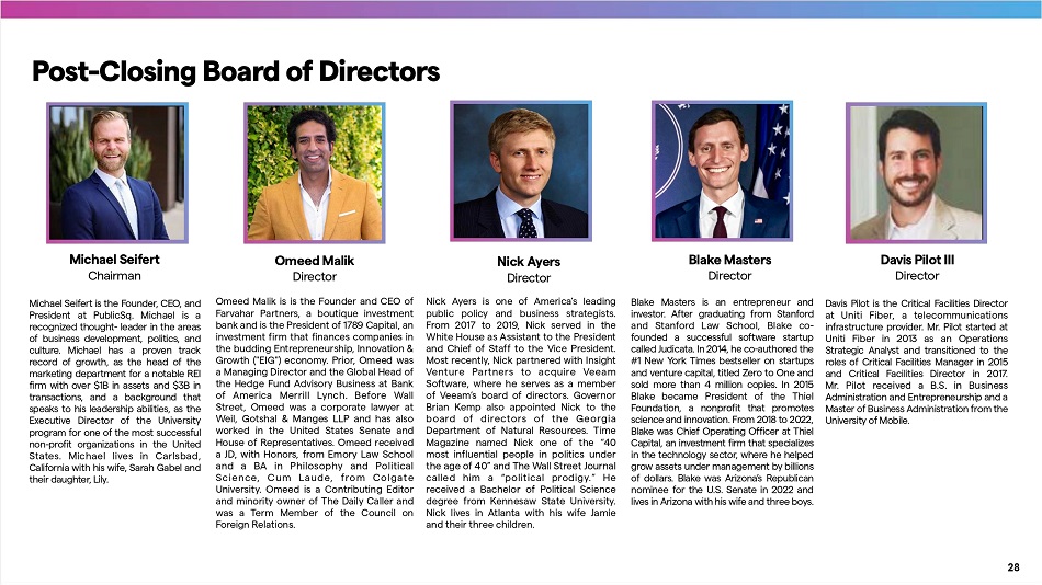 Post - Closing Board of Directors Blake Masters Director Blake Masters is an entrepreneur and investor . After graduating from Stanford and Stanford Law School, Blake co - founded a successful software sta r tup called Judicata . In 2014 , he co - authored the # 1 New York Times bestseller on sta r tups and venture capital, titled Zero to One and sold more than 4 million copies . In 2015 Blake became President of the Thiel Foundation, a nonprofit that promotes science and innovation . From 2018 to 2022 , Blake was Chief Operating Officer at Thiel Capital, an investment firm that specializes in the technology sector, where he helped grow assets under management by billions of dollars . Blake was Arizona’s Republican nominee for the U . S . Senate in 2022 and lives in Arizona with his wife and three boys . Michael Seife r t Chairman Michael Seife r t is the Founder, CEO, and President at PublicSq . Michael is a recognized thought - leader in the areas of business development, politics, and culture . Michael has a proven track record of growth, as the head of the marketing depa r tment for a notable REI firm with over $ 1 B in assets and $ 3 B in transactions, and a background that speaks to his leadership abilities, as the Executive Director of the University program for one of the most successful non - profit organizations in the United States . Michael lives in Carlsbad, California with his wife, Sarah Gabel and their daughter, Lily . Omeed Malik Director Omeed Malik is is the Founder and CEO of Farvahar Pa r tners, a boutique investment bank and is the President of 1789 Capital, an investment firm that finances companies in the budding Entrepreneurship, Innovation & Growth ("EIG") economy. Prior, Omeed was a Managing Director and the Global Head of the Hedge Fund Advisory Business at Bank of America Merrill Lynch. Before Wall Street, Omeed was a corporate lawyer at Weil, Gotshal & Manges LLP and has also worked in the United States Senate and House of Representatives. Omeed received a JD, with Honors, from Emory Law School and a BA in Philosophy and Political Science, Cum Laude, from Colgate University. Omeed is a Contributing Editor and minority owner of The Daily Caller and was a Term Member of the Council on Foreign Relations. Nick Ayers Director Nick Ayers is one of America’s leading public policy and business strategists . From 2017 to 2019 , Nick served in the White House as Assistant to the President and Chief of Staff to the Vice President . Most recently, Nick pa r tnered with Insight Venture Pa r tners to acquire Veeam Software, where he serves as a member of Veeam’s board of directors . Governor Brian Kemp also appointed Nick to the board of directors of the Georgia Depa r tment of Natural Resources . Time Magazine named Nick one of the “ 40 most influential people in politics under the age of 40 ” and The Wall Street Journal called him a “political prodigy . ” He received a Bachelor of Political Science degree from Kennesaw State University . Nick lives in Atlanta with his wife Jamie and their three children . Davis Pilot III Director Davis Pilot is the Critical Facilities Director at Uniti Fiber, a telecommunications infrastructure provider . Mr . Pilot sta r ted at Uniti Fiber in 2013 as an Operations Strategic Analyst and transitioned to the roles of Critical Facilities Manager in 2015 and Critical Facilities Director in 2017 . Mr . Pilot received a B . S . in Business Administration and Entrepreneurship and a Master of Business Administration from the University of Mobile . 28