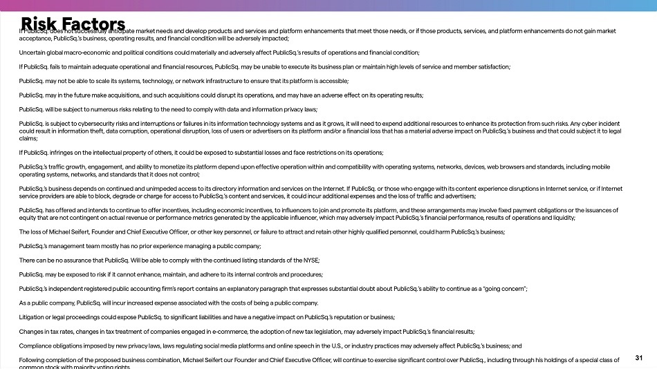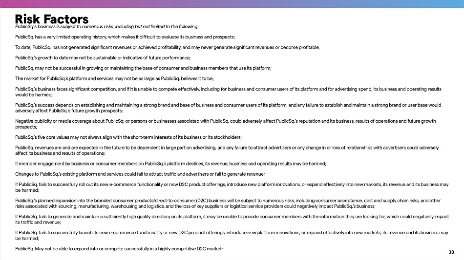 Risk Factors 30 PublicSq’.s business is subject to numerous risks, including but not limited to the following: PublicSq. has a very limited operating history, which makes it difficult to evaluate its business and prospects; To date, PublicSq. has not generated significant revenues or achieved profitability, and may never generate significant revenues or become profitable; PublicSq.’s growth to date may not be sustainable or indicative of future performance; PublicSq. may not be successful in growing or maintaining the base of consumer and business members that use its platform; The market for PublicSq.’s platform and services may not be as large as PublicSq. believes it to be; PublicSq.’s business faces significant competition, and if it is unable to compete effectively, including for business and consumer users of its platform and for adve r tising spend, its business and operating results would be harmed; PublicSq.’s success depends on establishing and maintaining a strong brand and base of business and consumer users of its platform, and any failure to establish and maintain a strong brand or user base would adversely affect PublicSq.’s future growth prospects; Negative publicity or media coverage about PublicSq. or persons or businesses associated with PublicSq. could adversely affect PublicSq.’s reputation and its business, results of operations and future growth prospects; PublicSq.’s five core values may not always align with the sho r t - term interests of its business or its stockholders; PublicSq. revenues are and are expected in the future to be dependent in large pa r t on adve r tising, and any failure to attract adve r tisers or any change in or loss of relationships with adve r tisers could adversely affect its business and results of operations; If member engagement by business or consumer members on PublicSq.’s platform declines, its revenue, business and operating results may be harmed; Changes to PublicSq.’s existing platform and services could fail to attract traffic and adve r tisers or fail to generate revenue; If PublicSq. fails to successfully roll out its new e - commerce functionality or new D2C product offerings, introduce new platform innovations, or expand effectively into new markets, its revenue and its business may be harmed; PublicSq.’s planned expansion into the branded consumer products/direct - to - consumer (D2C) business will be subject to numerous risks, including consumer acceptance, cost and supply chain risks, and other risks associated with sourcing, manufacturing, warehousing and logistics, and the loss of key suppliers or logistical service providers could negatively impact PublicSq.’s business; If PublicSq. fails to generate and maintain a sufficiently high quality directory on its platform, it may be unable to provide consumer members with the information they are looking for, which could negatively impact its traffic and revenue; If PublicSq. fails to successfully launch its new e - commerce functionality or new D2C product offerings, introduce new platform innovations, or expand effectively into new markets, its revenue and its business may be harmed; PublicSq. May not be able to expand into or compete successfully in a highly competitive D2C market;