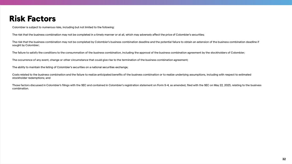 32 Colombier is subject to numerous risks, including but not limited to the following: The risk that the business combination may not be completed in a timely manner or at all, which may adversely affect the price of Colombier’s securities; The risk that the business combination may not be completed by Colombier’s business combination deadline and the potential failure to obtain an extension of the business combination deadline if sought by Colombier; The failure to satisfy the conditions to the consummation of the business combination, including the approval of the business combination agreement by the stockholders of Colombier; The occurrence of any event, change or other circumstance that could give rise to the termination of the business combination agreement; The ability to maintain the listing of Colombier’s securities on a national securities exchange; Costs related to the business combination and the failure to realize anticipated benefits of the business combination or to realize underlying assumptions, including with respect to estimated stockholder redemptions; and Those factors discussed in Colombier’s filings with the SEC and contained in Colombier’s registration statement on Form S - 4, as amended, filed with the SEC on May 22, 2023, relating to the business combination. Risk Factors