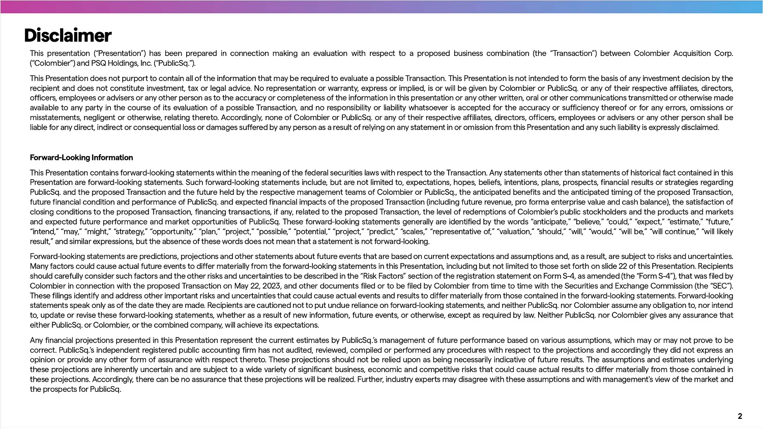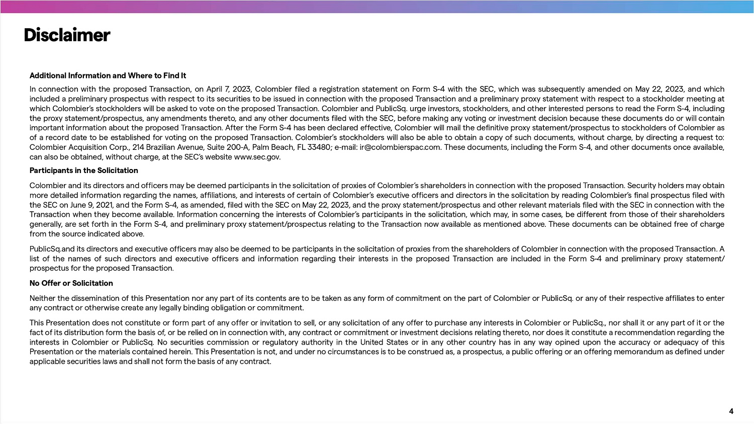 Additional Information and Where to Find It In connection with the proposed Transaction, on April 7 , 2023 , Colombier filed a registration statement on Form S - 4 with the SEC, which was subsequently amended on May 22 , 2023 , and which included a preliminary prospectus with respect to its securities to be issued in connection with the proposed Transaction and a preliminary proxy statement with respect to a stockholder meeting at which Colombier’s stockholders will be asked to vote on the proposed Transaction . Colombier and PublicSq . urge investors, stockholders, and other interested persons to read the Form S - 4 , including the proxy statement/prospectus, any amendments thereto, and any other documents filed with the SEC, before making any voting or investment decision because these documents do or will contain impo r tant information about the proposed Transaction . After the Form S - 4 has been declared effective, Colombier will mail the definitive proxy statement/prospectus to stockholders of Colombier as of a record date to be established for voting on the proposed Transaction . Colombier’s stockholders will also be able to obtain a copy of such documents, without charge, by directing a request to : Colombier Acquisition Corp . , 214 Brazilian Avenue, Suite 200 - A, Palm Beach, FL 33480 ; e - mail : ir@colombierspac . com . These documents, including the Form S - 4 , and other documents once available, can also be obtained, without charge, at the SEC’s website www . sec . gov . Pa r ticipants in the Solicitation Colombier and its directors and officers may be deemed pa r ticipants in the solicitation of proxies of Colombier’s shareholders in connection with the proposed Transaction . Security holders may obtain more detailed information regarding the names, affiliations, and interests of ce r tain of Colombier’s executive officers and directors in the solicitation by reading Colombier’s final prospectus filed with the SEC on June 9 , 2021 , and the Form S - 4 , as amended, filed with the SEC on May 22 , 2023 , and the proxy statement/prospectus and other relevant materials filed with the SEC in connection with the Transaction when they become available . Information concerning the interests of Colombier’s pa r ticipants in the solicitation, which may, in some cases, be different from those of their shareholders generally, are set fo r th in the Form S - 4 , and preliminary proxy statement/prospectus relating to the Transaction now available as mentioned above . These documents can be obtained free of charge from the source indicated above . PublicSq . and its directors and executive officers may also be deemed to be pa r ticipants in the solicitation of proxies from the shareholders of Colombier in connection with the proposed Transaction . A list of the names of such directors and executive officers and information regarding their interests in the proposed Transaction are included in the Form S - 4 and preliminary proxy statement/ prospectus for the proposed Transaction . No Offer or Solicitation Neither the dissemination of this Presentation nor any pa r t of its contents are to be taken as any form of commitment on the pa r t of Colombier or PublicSq . or any of their respective affiliates to enter any contract or otherwise create any legally binding obligation or commitment . This Presentation does not constitute or form pa r t of any offer or invitation to sell, or any solicitation of any offer to purchase any interests in Colombier or PublicSq . , nor shall it or any pa r t of it or the fact of its distribution form the basis of, or be relied on in connection with, any contract or commitment or investment decisions relating thereto, nor does it constitute a recommendation regarding the interests in Colombier or PublicSq . No securities commission or regulatory authority in the United States or in any other country has in any way opined upon the accuracy or adequacy of this Presentation or the materials contained herein . This Presentation is not, and under no circumstances is to be construed as, a prospectus, a public offering or an offering memorandum as defined under applicable securities laws and shall not form the basis of any contract . 4 Disclaimer