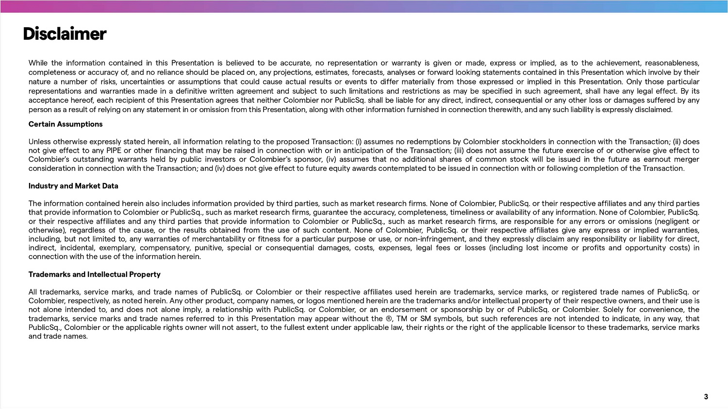Disclaimer 2 This presentation (“Presentation”) has been prepared in connection making an evaluation with respect to a proposed business combination (the “Transaction”) between Colombier Acquisition Corp . (“Colombier”) and PSQ Holdings, Inc . (“PublicSq . ”) . This Presentation does not purpo r t to contain all of the information that may be required to evaluate a possible Transaction . This Presentation is not intended to form the basis of any investment decision by the recipient and does not constitute investment, tax or legal advice . No representation or warranty, express or implied, is or will be given by Colombier or PublicSq . or any of their respective affiliates, directors, officers, employees or advisers or any other person as to the accuracy or completeness of the information in this presentation or any other written, oral or other communications transmitted or otherwise made available to any pa r ty in the course of its evaluation of a possible Transaction, and no responsibility or liability whatsoever is accepted for the accuracy or sufficiency thereof or for any errors, omissions or misstatements, negligent or otherwise, relating thereto . Accordingly, none of Colombier or PublicSq . or any of their respective affiliates, directors, officers, employees or advisers or any other person shall be liable for any direct, indirect or consequential loss or damages suffered by any person as a result of relying on any statement in or omission from this Presentation and any such liability is expressly disclaimed . F o r w a r d - L oo k i n g I n f o r m a t i o n This Presentation contains forward - looking statements within the meaning of the federal securities laws with respect to the Transaction . Any statements other than statements of historical fact contained in this Presentation are forward - looking statements . Such forward - looking statements include, but are not limited to, expectations, hopes, beliefs, intentions, plans, prospects, financial results or strategies regarding PublicSq . and the proposed Transaction and the future held by the respective management teams of Colombier or PublicSq . , the anticipated benefits and the anticipated timing of the proposed Transaction, future financial condition and performance of PublicSq . and expected financial impacts of the proposed Transaction (including future revenue, pro forma enterprise value and cash balance), the satisfaction of closing conditions to the proposed Transaction, financing transactions, if any, related to the proposed Transaction, the level of redemptions of Colombier’s public stockholders and the products and markets and expected future performance and market oppo r tunities of PublicSq . These forward - looking statements generally are identified by the words “anticipate,” “believe,” “could,” “expect,” “estimate,” “future,” “intend,” “may,” “might,” “strategy,” “oppo r tunity,” “plan,” “project,” “possible,” “potential,” “project,” “predict,” “scales,” “representative of,” “valuation,” “should,” “will,” “would,” “will be,” “will continue,” “will likely result,” and similar expressions, but the absence of these words does not mean that a statement is not forward - looking . Forward - looking statements are predictions, projections and other statements about future events that are based on current expectations and assumptions and, as a result, are subject to risks and unce r tainties . Many factors could cause actual future events to differ materially from the forward - looking statements in this Presentation, including but not limited to those set fo r th on slide 22 of this Presentation . Recipients should carefully consider such factors and the other risks and unce r tainties to be described in the “Risk Factors” section of the registration statement on Form S - 4 , as amended (the “Form S - 4 ”), that was filed by Colombier in connection with the proposed Transaction on May 22 , 2023 , and other documents filed or to be filed by Colombier from time to time with the Securities and Exchange Commission (the “SEC”) . These filings identify and address other impo r tant risks and unce r tainties that could cause actual events and results to differ materially from those contained in the forward - looking statements . Forward - looking statements speak only as of the date they are made . Recipients are cautioned not to put undue reliance on forward - looking statements, and neither PublicSq . nor Colombier assume any obligation to, nor intend to, update or revise these forward - looking statements, whether as a result of new information, future events, or otherwise, except as required by law . Neither PublicSq . nor Colombier gives any assurance that either PublicSq . or Colombier, or the combined company, will achieve its expectations . Any financial projections presented in this Presentation represent the current estimates by PublicSq . ’s management of future performance based on various assumptions, which may or may not prove to be correct . PublicSq . ’s independent registered public accounting firm has not audited, reviewed, compiled or performed any procedures with respect to the projections and accordingly they did not express an opinion or provide any other form of assurance with respect thereto . These projections should not be relied upon as being necessarily indicative of future results . The assumptions and estimates underlying these projections are inherently unce r tain and are subject to a wide variety of significant business, economic and competitive risks that could cause actual results to differ materially from those contained in these projections . Accordingly, there can be no assurance that these projections will be realized . Fu r ther, industry expe r ts may disagree with these assumptions and with management's view of the market and the prospects for 