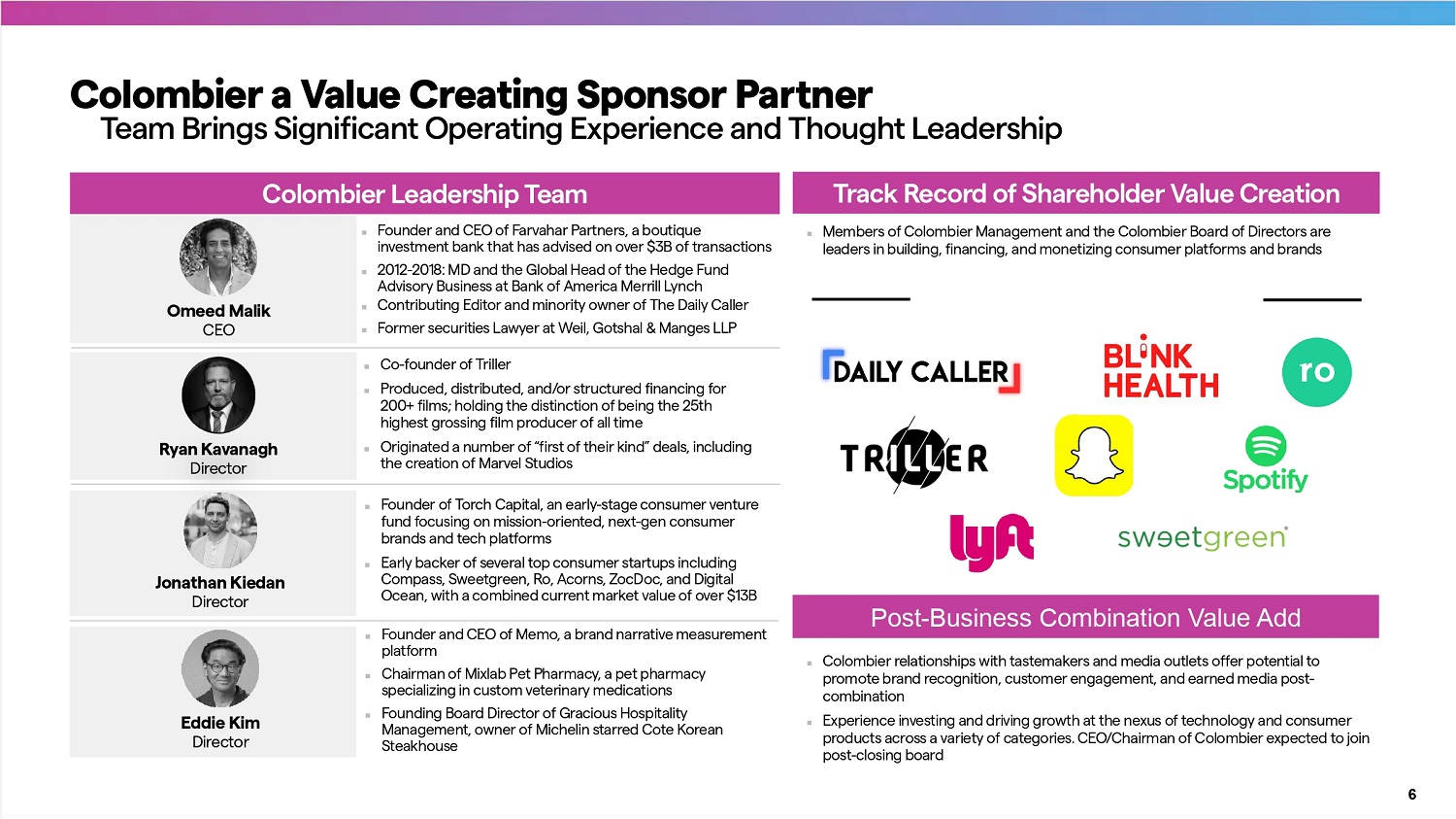 Colombie r Le ade r shi p T e am ▪ F o u n d e r a n d C E O o f F a r v a h a r P a r tne r s , a boutique investment bank that has advised on over $3B of transactions ▪ 20 12 - 20 18 : M D an d t h e Glo b a l H e a d o f t h e Hedg e F und Advisory Business at Bank of America Merrill Lynch ▪ Contributing Editor and minority owner of The Daily Caller ▪ Former securities Lawyer at Weil, Gotshal & Manges LLP ▪ Co - founder of Triller ▪ Produced, distributed, and/or structured financing for 200+ films; holding the distinction of being the 25th highe s t g r o ssin g fil m p r oduce r o f al l time ▪ Originated a number of “first of their kind” deals, including t h e c r e a t i o n o f M a r v e l S tu d i o s ▪ Colombier relationships with tastemakers and media outlets offer potential to promote brand recognition, customer engagement, and earned media post - combination ▪ Experience investing and driving growth at the nexus of technology and consumer products across a variety of categories. CEO/Chairman of Colombier expected to join post - closing board ▪ Members of Colombier Management and the Colombier Board of Directors are leaders in building, financing, and monetizing consumer platforms and brands ▪ F o u n d e r a n d C E O o f M e m o , a b r a n d n a r r a t i v e m e a s u r e m e n t platform ▪ Chairma n o f Mixla b P e t Pharma c y , a p e t pharma c y specializing in custom veterinary medications ▪ F o u n d i n g B o a r d D i r e c t o r o f G r a c i o u s H o s p i t a l i t y Management, owner of Michelin starred Cote Korean Steakhouse ▪ F o u n d e r o f T o r c h C ap i t a l , a n e a r l y - s t a g e c o n s u m e r v e n tu r e fund focusing on mission - oriented, next - gen consumer brands and tech platforms ▪ E a r l y b a c k e r o f s e v e r a l t o p c o n s u m e r s t a r t u p s i n c l u d i n g Compass, Sweetgreen, Ro, Acorns, ZocDoc, and Digital Ocean, with a combined current market value of over $13B Team Brings Significant Operating Experience and Thought Leadership Colombie r a V alu e C r e a tin g Sponso r P a r tner T r a c k R e c o r d o f S h a r e h o l d e r V a l u e C r e a t i o n Post - Business Combinatio n V alu e Add Omee d Malik CEO E dd i e K i m Director R y a n K a v a n a g h Director J o n a t ha n K i e d a n Director 6