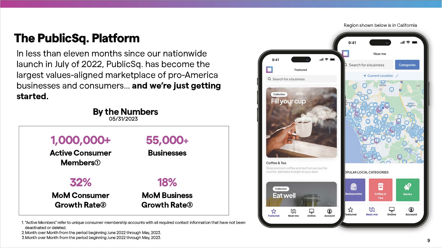 Th e P ublicSq . Pl a t f orm 9 In less than eleven months since our nationwide launch in July of 2022, PublicSq. has become the largest values - aligned marketplace of pro - America businesses and consumers... and we’re just getting sta r ted. B y t h e N u mb e r s 55,000 + Businesses 1,000,000+ A c t i v e C o n s u m e r Members ᕭ 41% Mo M Consumer G r o w t h R a t e £ 1. “Active Members” refer to unique consumer membership accounts with all required contact information that have not been deactivated or deleted. 2. Month over Month from the period beginning May 2022 through May, 2023. 3.Month over Month from the period beginning May 2022 through May, 2023. 39% Mo M Busin e ss G r o w t h R a t e ¤ Region shown below is in California 05/31/2023